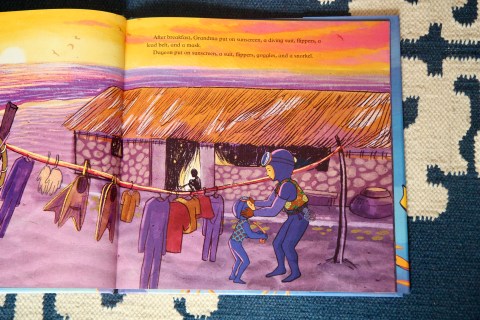 As readers, we now get a firsthand view of the haenyeo experience, diving deep while harnessed to an orange net which stays buoyed on the water’s surface. It takes Dayeon a few tries to hold her breath long enough, but with Grandma’s help she eventually reaches a “garden of sparkling treasures” on the ocean’s floor. Here, time seems almost to suspend, as Grandma and the other haenyeo gather urchins, cucumbers, octopuses, snails and abalone (Dayeon’s favorite), which they will use to feed their families and sell at market. The book’s Afterward goes into greater detail about the haenyeo fishing practices, including their intimate knowledge of the lunar calendar, weather patterns, spawning seasons, and marine life behavior. The haenyeo are dedicated conservationists, never taking more than what they need.