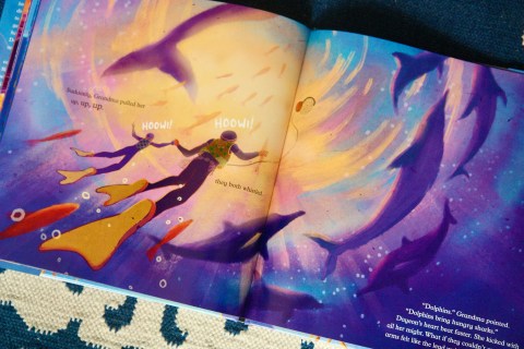Because of her special relationship with the sea, Grandma knows instantly when they need to abort; in this case, a ring of dolphins signals potential shark activity. Along with the other divers, the two make their way to the surface, letting out their breath in a whistle, and are pulled into the safety of a waiting boat. The danger is real, but like everything else in the ocean, it is illustrated here with awe-inspiring beauty.