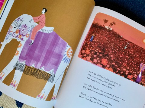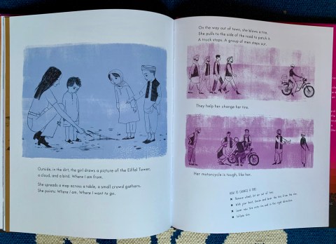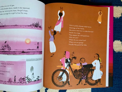 The hiccups the girl encounters are as fascinating as the shifting landscape. Her bike runs out of gas. Her bike breaks down. A lot. But when she can’t fix something herself, she has a chance to meet new people, to immerse herself a little deeper in the culture. She pays mechanics with “hand-drawn hearts” and receives henna drawings on her own hands by local children who wait with her. That she encounters kindness wherever she goes is a reassuring message for our future travelers.