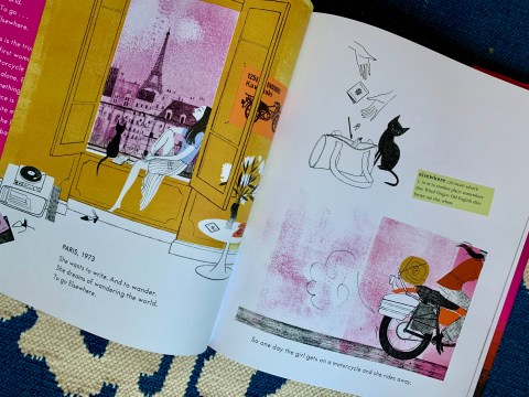 Morstad is no stranger to illustrating picture book biographies—It Began With a Page: How Gyo Fujikawa Drew the Way made last year’s Gift Guide—and part of her remarkable talent stems from adapting her illustrative style to the subject at hand, while still creating a look and feel entirely her own. In Girl on a Motorcycle, Morstad infuses a ’70s palette of glowy browns and moody mauves onto the dusty backdrops of the Middle East, the dense evergreens of the Canadian countryside, and the ethereal sunrises. Additionally, Morstad gives the protagonist herself a kind of badass glamour every bit as alluring as the scenery itself. How can we not fall for someone who packs lipstick next to a “sharp knife”? It’s as if Vogue jumped on the back of a motorcycle, slept in a tent at night, and made friends with locals along the way.