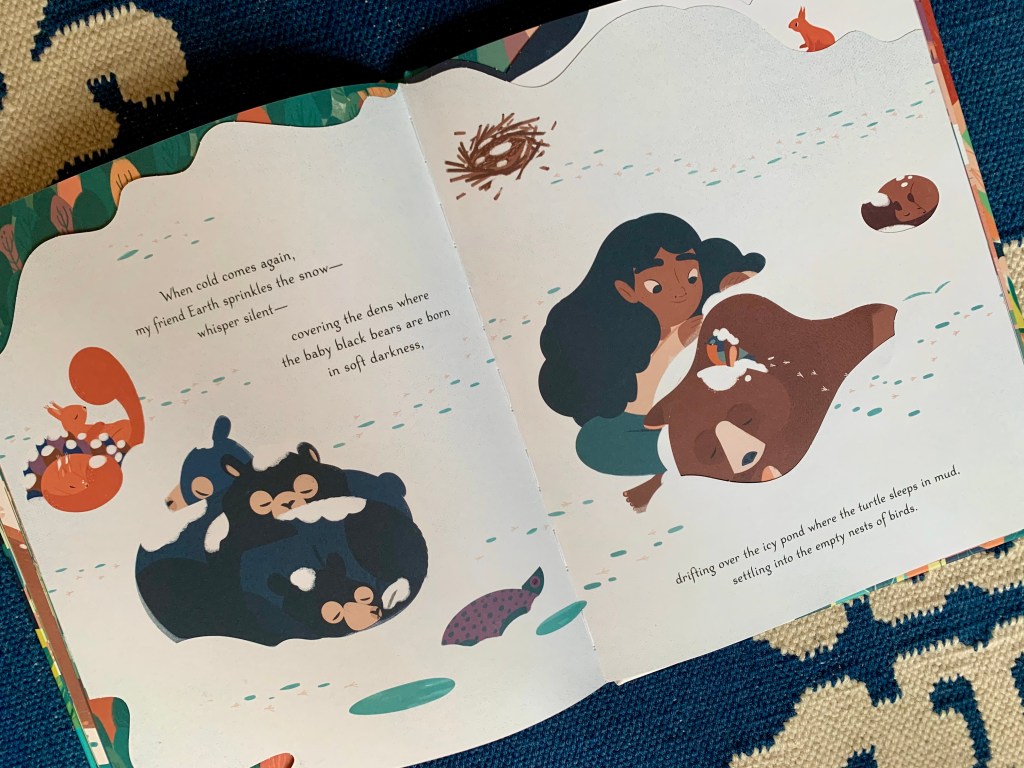 And I love the way Francesca Sanna’s artwork infuses playfulness into the relationship between Earth and her surroundings. She rides on the back of an albatross; she curls up in a falling leaf; she wraps her arms around a snowbank full of dormant animals. At times we catch the tiniest glimpse of mischief on her face.