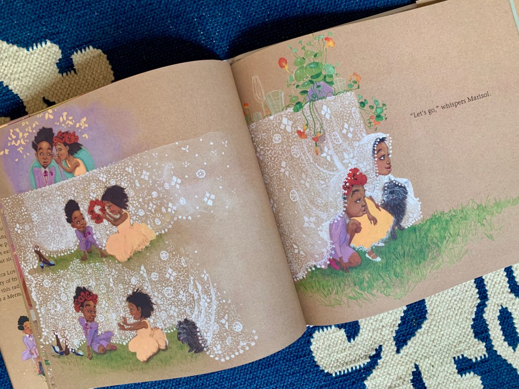 Julián and his abuela are off to a wedding for two brides. Julián, clad in a dapper purple suit and purple shoes, gets to be in the wedding, alongside a girl named Marisol wearing a crown of poppies and a peach tulle dress. Everyone knows the best part of being a kid at a wedding isn’t just walking the dog down the aisle or sprinkling flower petals; it’s the unsupervised time, while the grown-ups are preoccupied, to sneak off and make some revelry of your own. Julián and Marisol hatch their plans under the brides’ table, before disappearing into a fairy house of their own creation.