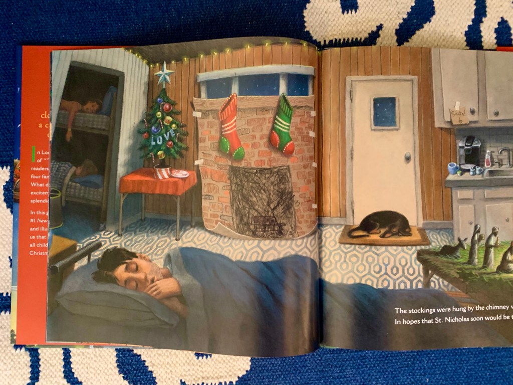 “‘Twas the night before Christmas, when all through the house/ Not a creature was stirring, not even a mouse.” Right away, readers are asked to pay close attention to setting. The opening spread will be familiar to anyone who has read previous versions of the poem: a plush, brightly decorated living room, with a great stone hearth and a bucolic view of snowy hillsides through the window. But a page turn quickly establishes that the stockings “hung by the chimney with care” are not the ones from the previous page. Here, a white father sleeps on a pull-out couch in a kitchen, his kids on bunk beds in the next room, with stockings pinned to a crayon drawing of a brick fireplace.