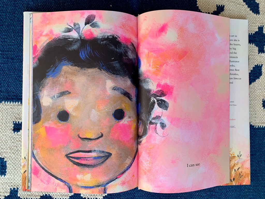 It took me until the book’s final page to realize that, for a book with “tree” in its title, Corinna has, in fact, used no green in her artwork. I think this was the moment I knew I wanted to interview her—and I can’t wait for you to read in Thursday’s post what she says about the specific color choices she made for this book. Without giving away too much, I will say only that I think Corinna has tremendous respect for her young readers, including and especially for the work they are doing, every single day, to make sense of their place in the world. Replacing green with neon pink lends the book a transcendent quality. It’s about more than trees. It’s about more than about our relationship to trees. The Tree in Me is a celebration of the life force that runs through all living things.