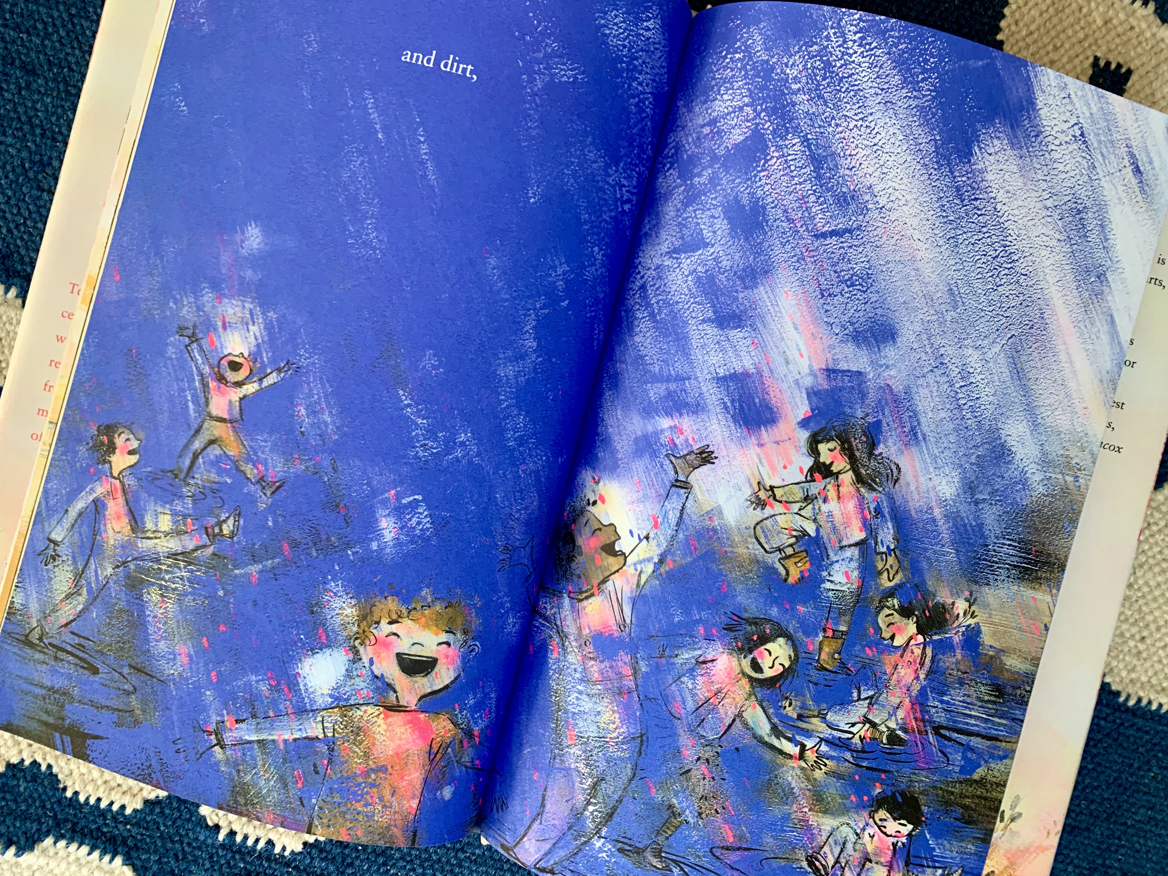 Then there are the forces that act upon the tree—the wind, rain, dirt, and sky—which remind us that a tree, like us, is never static. In one of my favorite spreads, the arc of a child’s long black hair matches that of a leaning tree. “And because there is/ a tree in me,/ there is wind[…]”