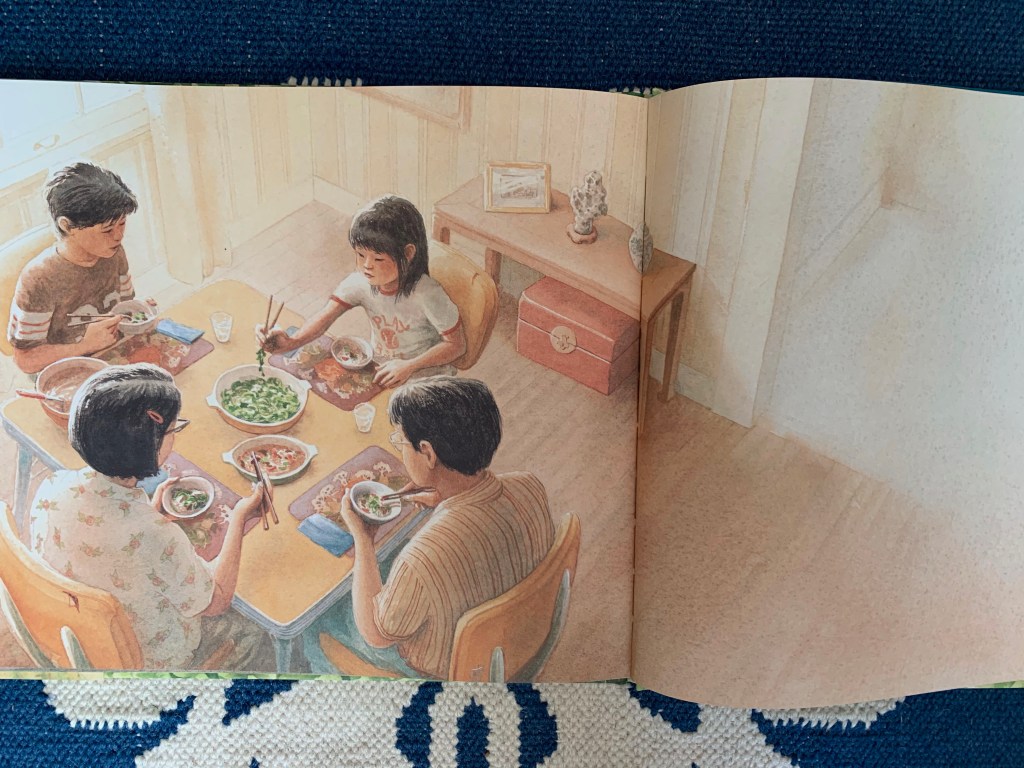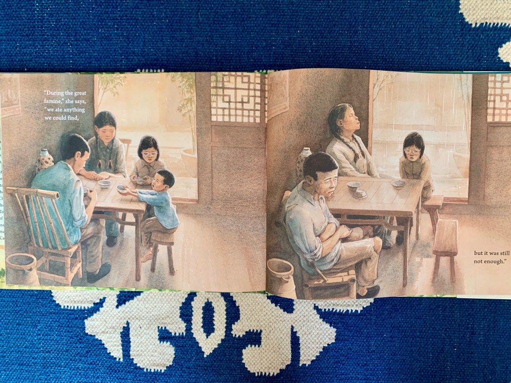 As the mother describes a time in China during the great famine, when her family ate whatever they could find and it was still not enough, two side-by-side illustrations fill in the gaps: in one, four members of the family sit around the table; in the other, there are only three, the young boy’s stool empty, his family’s faces pinched with grief.