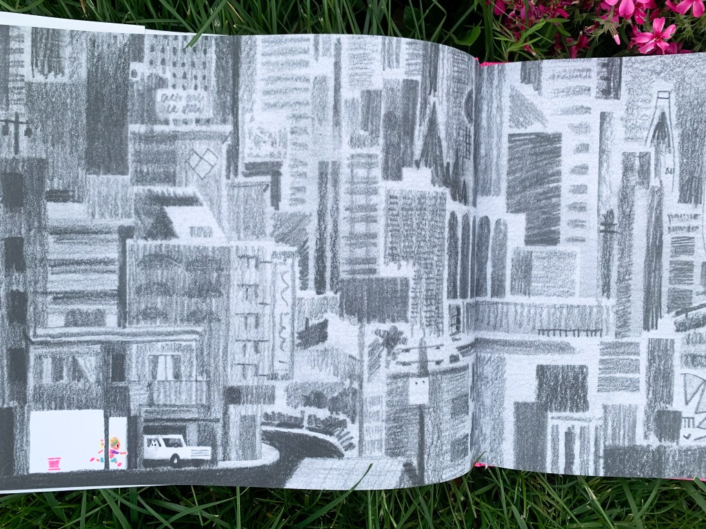 For such a colorful cover, the story actually begins with the grey scale of a cityscape, from which our protagonist flees by car with her little white dog. Presumably, there’s an adult driving the car, though we never see one. The only “grown-up” in this child-centric story comes in the voice of the second-person narrator, who speaks at once to the child in the story and to us readers along for the ride.