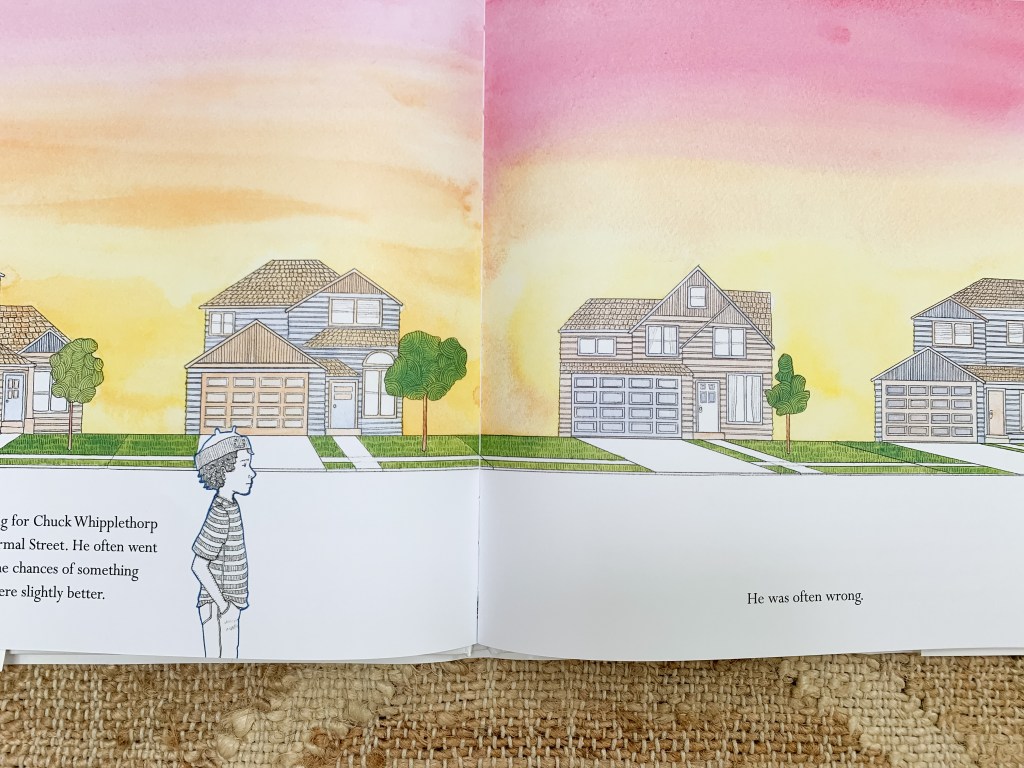 Chuck Whipplethorp has just moved into a new house on Normal Street, where when he isn’t draped over the back of the couch avoiding unpacking, he wanders around his new neighborhood, expecting something exciting to happen. (“He was often wrong.”) We know from an illustration on the book’s title page that Chuck’s nuclear family consists of him, his dad, and his mom, though we only see the mom in the mornings, presumably before she heads out to work. The boy spends his days in the company of his dad.