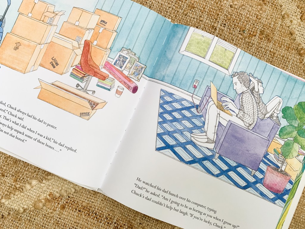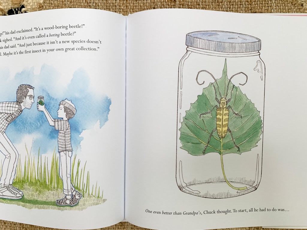 On one particular summer day, Chuck is so bored—and his dad so preoccupied with his computer—that he decides to unpack a few boxes. As he opens a long, flat box, he finds “a glass case filled with brightly colored insects perfectly pinned to a board.” This, his dad informs him, is his grandfather’s first bug collection, assembled when he was nine. The man went on to become a famed entomologist, discovering “a whole new species” when he was older.