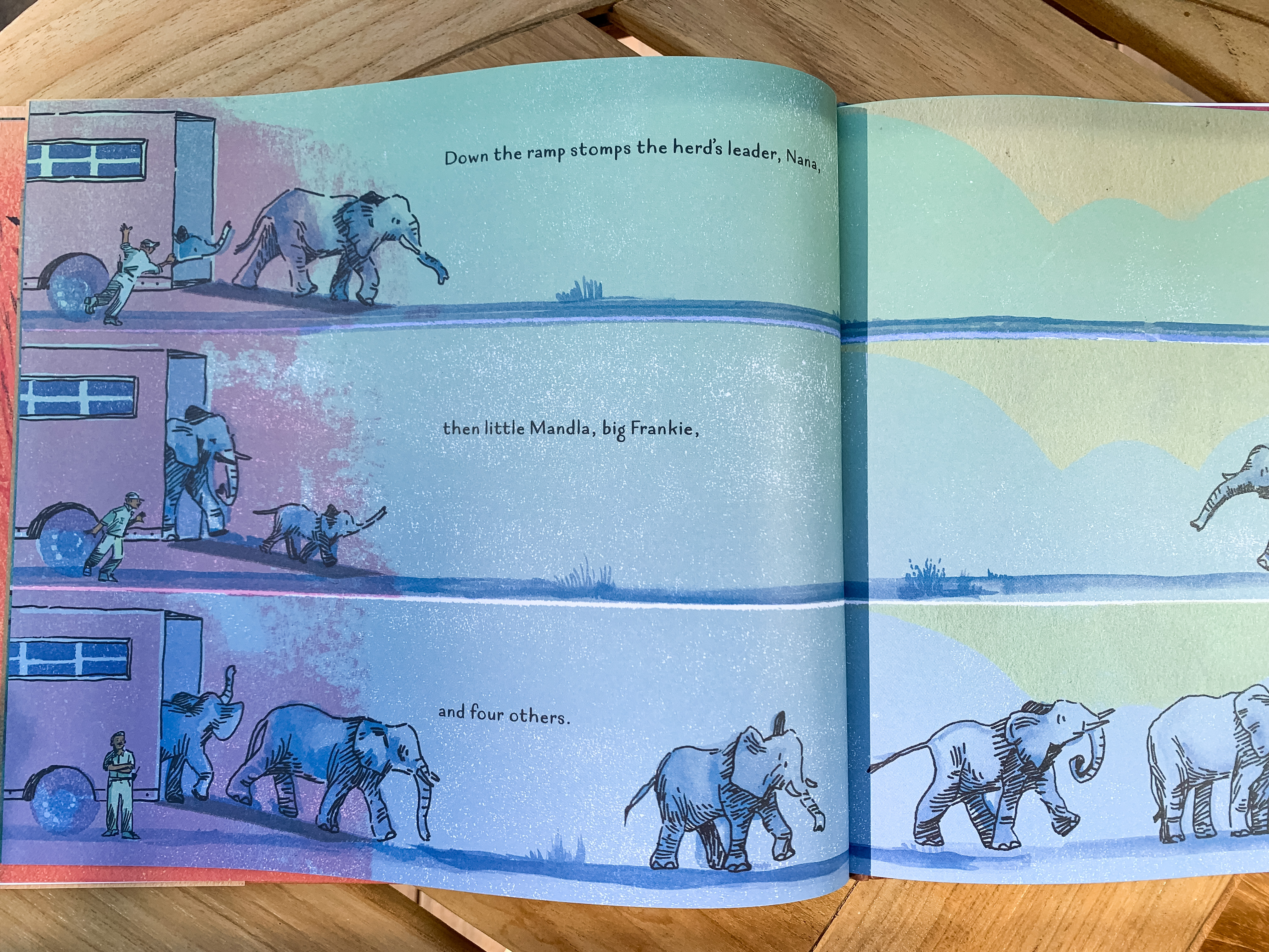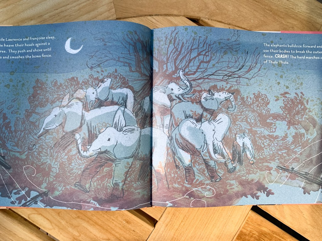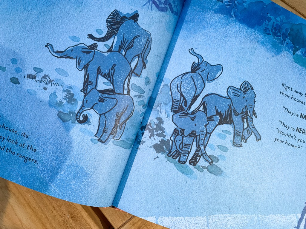 The elephants arrive by trailer in the middle of the night and, well, they aren’t happy about it. They’ve been bullied and hunted in their former life, and now they’ve got a baby they’re trying to protect. They “pound their hooves and trumpet angrily,” but where most of the rangers look at the elephants and see threat, Lawrence sees the bigger picture: the elephants are nervous. “Wouldn’t you be if you moved far from your home?” Several spreads are bathed in a deep, moody blue to mirror the elephants’ distress.