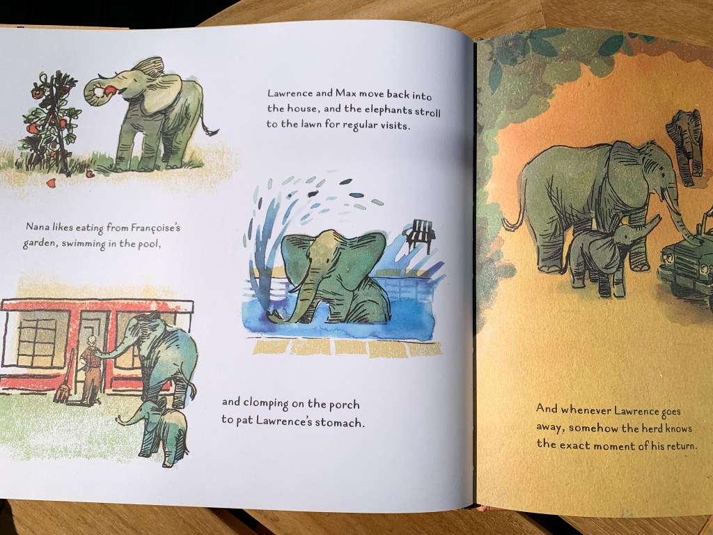 And then, Lawrence dies, a moment the book’s author and illustrator honor with grace and tenderness. Françoise and Max mourn him, but so do the elephants, hundreds of miles away. With an awareness of grief that is almost unparalleled in the animal world, the elephants register instinctively that one of their own has died—and all of them begin the long journey back to Lawrence’s house.