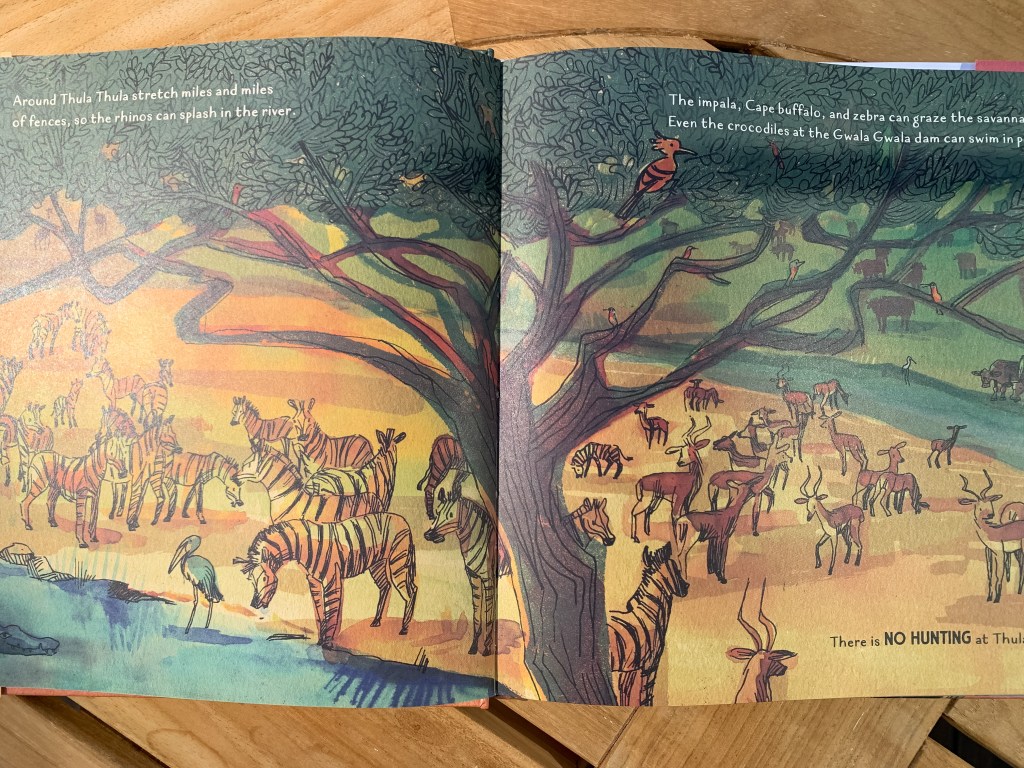 Lawrence (who “loves animals”), Francoise (who “loves Lawrence”), and their dog Max are the resident caretakers of Thula Thula, a wildlife sanctuary which encompasses a farmhouse, a garden, a swimming pool, and 11,000 acres of African bush, savanna, and forest—all protected from the neighboring Zulu villages and prospective hunters by miles and miles of fencing. Think rhinos splashing in the river, zebras grazing the savannas, and crocodiles basking in the sun. Hadley Hooper expertly combines washes of color to invoke the heat of the African plains, the dappled lushness of tree canopies, and the scintillating pops of clear, blue water. Beneath these colors, the paper’s texture shows through, a grittiness that echoes the physicality of the land that itself plays an important role in the story.