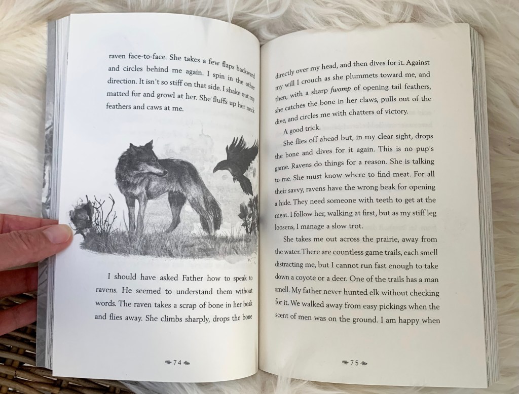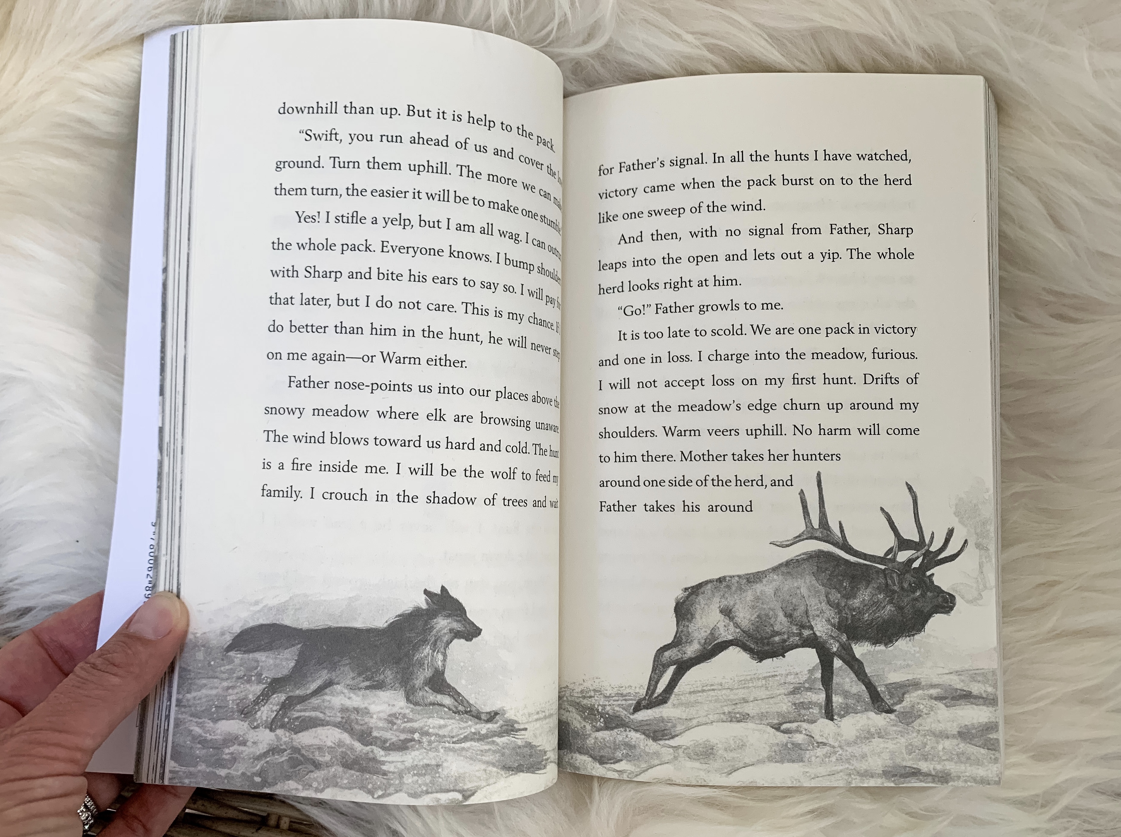 We may have been a few states away from Swift’s story, but we knew there were wolves in the mountains around us. We knew they were probably closer than we realized, hiding from view, as we explored Yellowstone National Park. Reading this book together—including marveling over the plentiful grey-and-white illustrations by Mónica Armiño—allowed us to appreciate the biodiversity around us. The unseen lives. The brutal, beautiful struggle for survival. The way our protagonist would strike down an elk without mercy, but stand back in awe as a string of wild horses stood before him. The way he forged partnerships with scavengers, like a black raven, who saved his life numerous times by guiding him to water. They way he hungered for food, thought of it constantly—but was nearly consumed by an even deeper hunger for companionship.