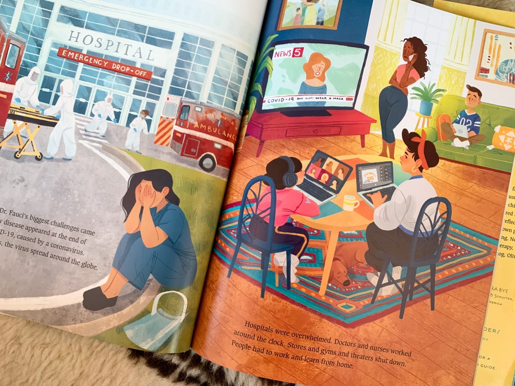 After graduating first in his class from Cornell, he went to work at the National Institute of Allergy and Infectious Diseases and became “one of the country’s top experts on what makes [people] sick…and how to make them well.” The next spreads are devoted to some of the emerging diseases in the years that followed, particularly AIDS, and the way Fauci led teams of researchers and advised presidents on their findings.