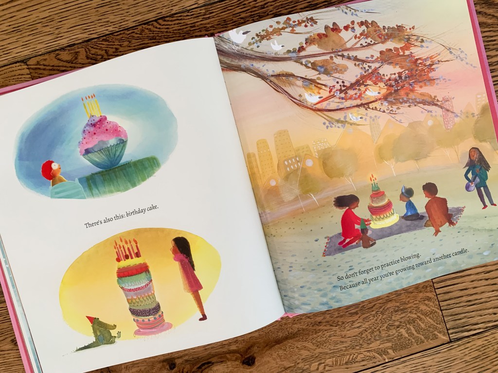 Over the course of the book, there is talk of presents, though alongside a reminder that “sometimes the best one is knowing the whole day is yours.” There are three kinds of colorful birthday cake, with a reminder that “all year you’re growing toward another candle.”