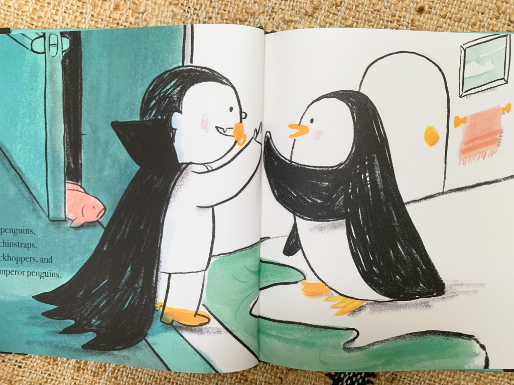 Which brings us to 2021, where I’ve combed through dozens of Halloween-ish new releases to tell you my favorite. The story I’ve chosen is about vampires—of the modern, hip, urban variety—though it has nothing to do with the actual holiday of Halloween. Which means you get to decide whether you pack it up on November 1st or let it stay out all year round. Who am I kidding? There’s not a chance your kiddos are going to let you pack up this one. In Vampenguin (Ages 3-6), Lucy Ruth Cummins—no stranger to the Halloween market ever since she wrote the darling Stumpkin—has created a story that abounds with visual gags and makes perfect use of that irresistible trope of storytelling, where the reader is in on the joke long before the characters themselves are.