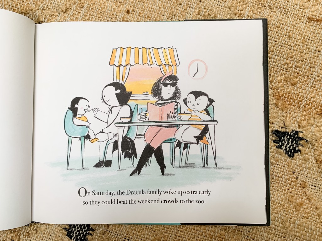 It’s Saturday, and the Dracula family—mom, dad, and two kids—are up early to beat the crowds to the zoo. They’re not the only ones with this inspired idea, but they eventually get through the turnstiles and into a zoo that bears (is it just me?) a striking resemblance to New York City’s Central Park Zoo, where I grew up going on special Saturdays. Just like in our family, “their first stop was always the Penguin House.”