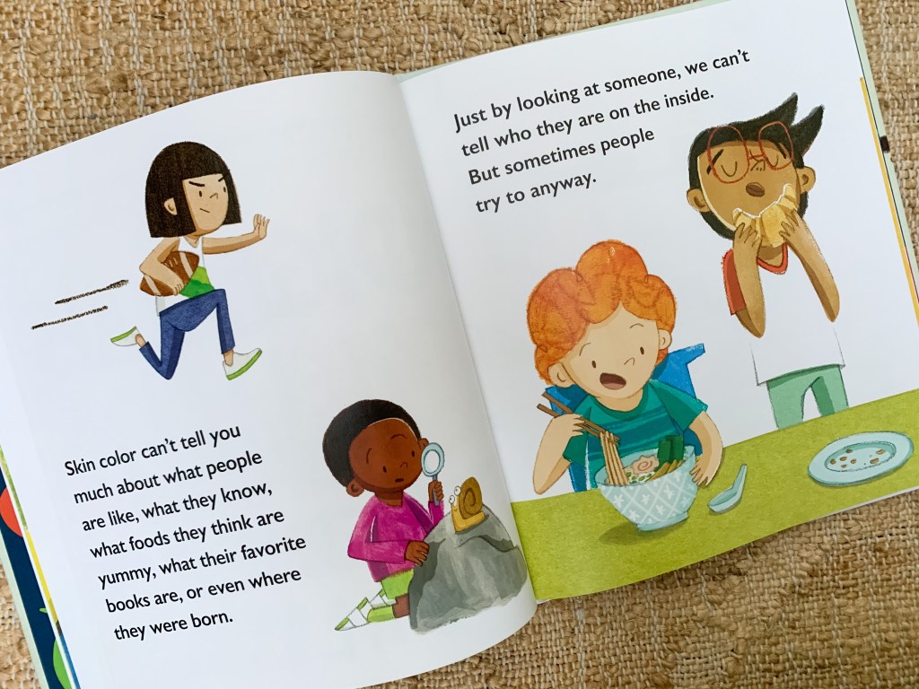 The role of melanin is introduced, as children are asked to observe their own unique skin tone and those around them. Identifiers like Black, Asian, white, Latinx, biracial, and more are mentioned. We’re told that people try to figure out what “people are like” based on the color of their skin, when, in fact, skin color doesn’t tell us “what foods they think are yummy, what their favorite books are, or even where they were born.” Racism is likened to a “story” made up a long time ago—one that isn’t true or fair but continues to be told.