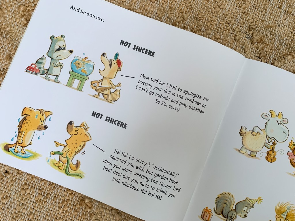 What I love most about this book are the spreads devoted to the language of apologies, in how to acknowledge hurt and graciously accept responsibility. Examples of insincere apologies, wildly exaggerated for read-aloud flair, are presented alongside sincere ones. If it’s too stressful to apologize in person, readers are encouraged to write a note (something my own kids are big fans of). Even if a transgression occurred a long time ago, an apology today still counts.