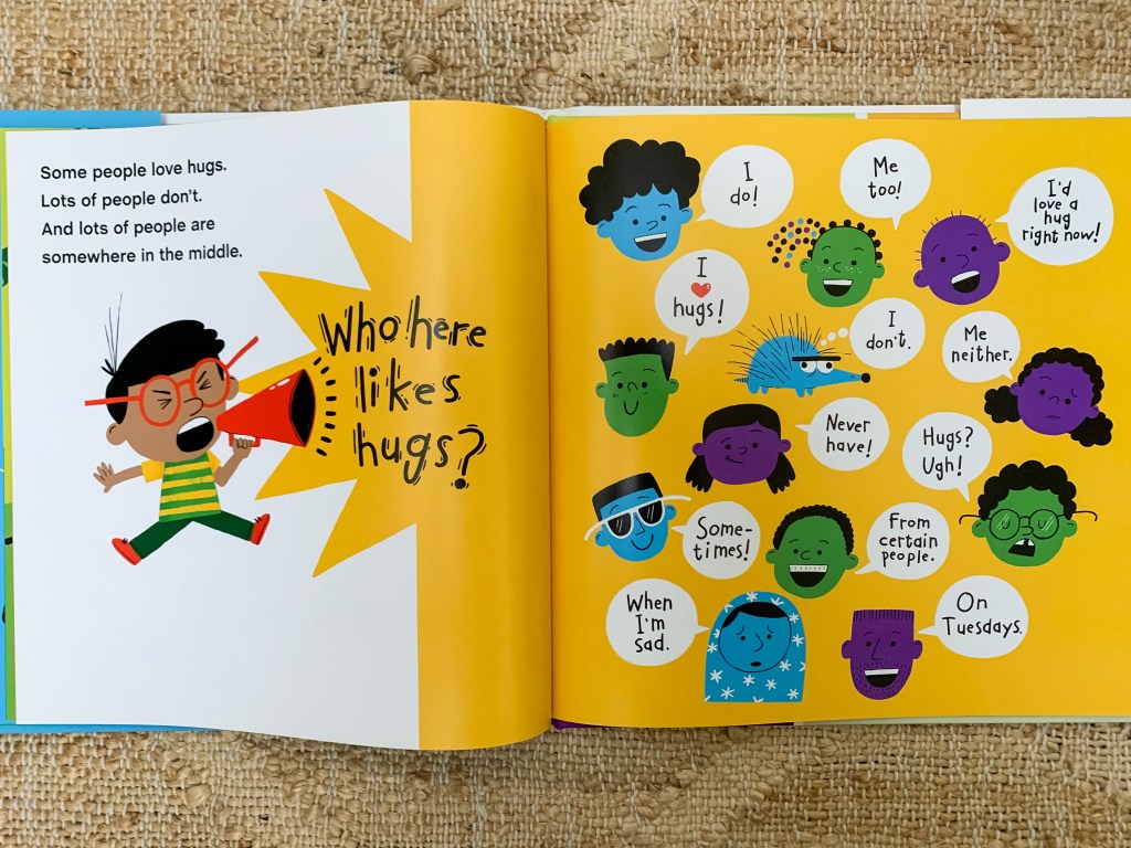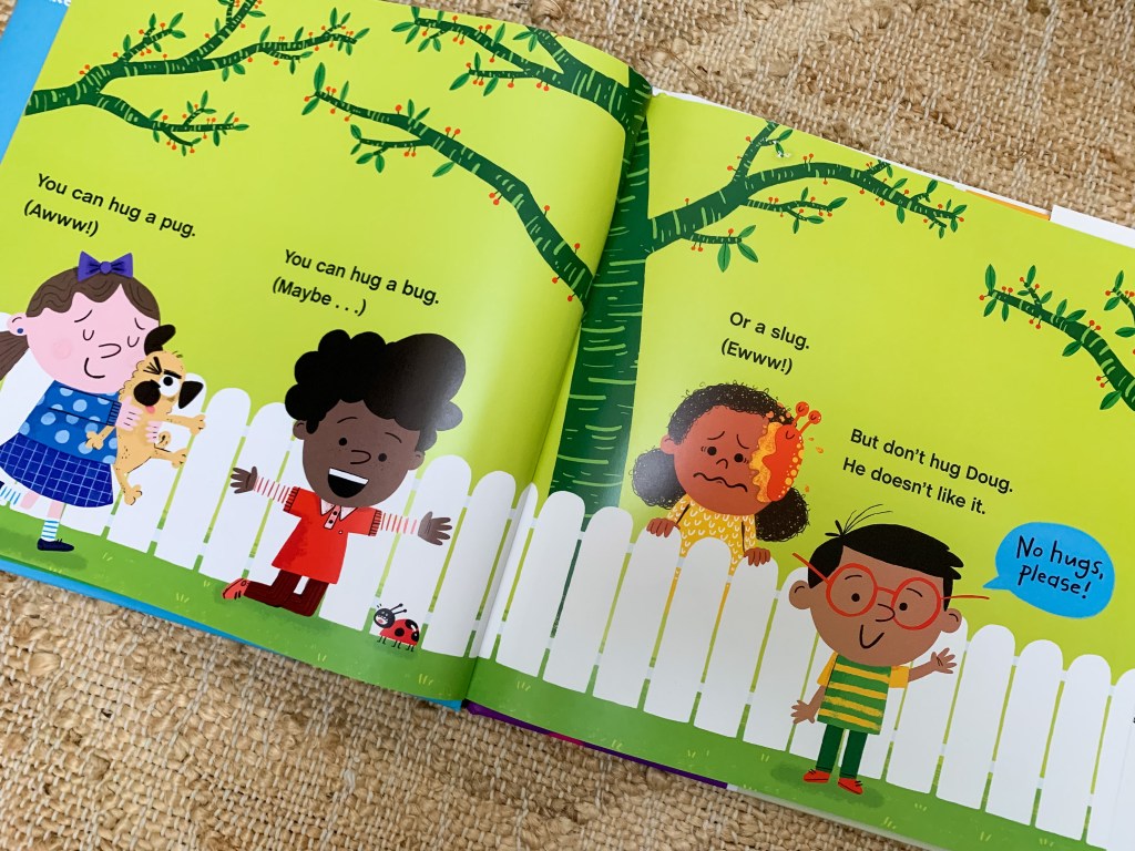 Carrie Finison and Daniel Wiseman’s Don’t Hug Doug (He Doesn’t Like It) offers an example of boundary setting that feels like the most natural thing in the world. (Like, why haven’t we been doing this all along?) Through word play, speech bubbles, and funny asides, we are introduced to Doug: a regular, curious, fun-loving kid, who happens to think hugs are “too squeezy, too squashy, too squooshy, too smooshy.” Is this a reflection of how Doug feels about his friends and family? Nope! Doug loves his friends and family. He just doesn’t like hugs. Is this a reflection of Doug not liking anything? Nope! Doug likes lots of things other kids do, including rocks, chalk, and harmonicas.