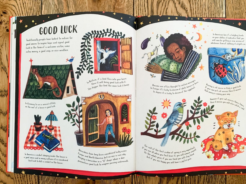 My favorite spreads are the ones on good luck, bad luck, and lucky charms. I was a superstitious child. The night before a big test in middle or high school, I always set out worry dolls on my nightstand. I’ve always loved my son’s enthusiasm for seeking out four-leaf clovers. Did you know in Britain it’s considered bad luck to make a fire from wood that has been struck by lightning, or that the luckiest way to illustrate an elephant in India is with its trunk up?