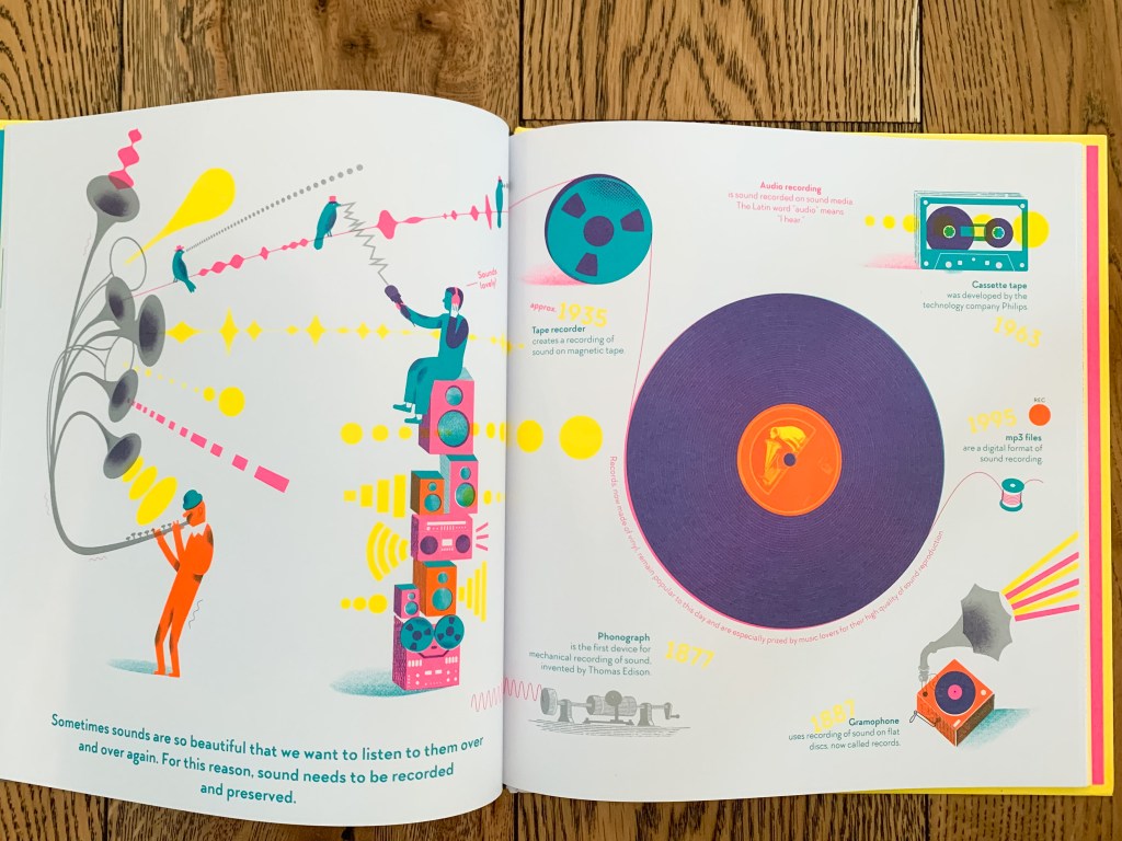 The art in Sound: Shhh…Bang…POP…BOOM! hums and buzzes as it speaks to the qualities, sources, and uses of sound, as well as how we process auditory signals. The cacophony of life is everywhere, from trombones and gramophones, to rumbling bellies and crying babies, to honking cars and chirping birds. Have you ever thought of your home as a symphony of whooshes, stomps, clicks, and rings? Several pages are devoted to music and melody: “in the sea of known and unknown sounds, we look for order and harmony. This is how music is born.”