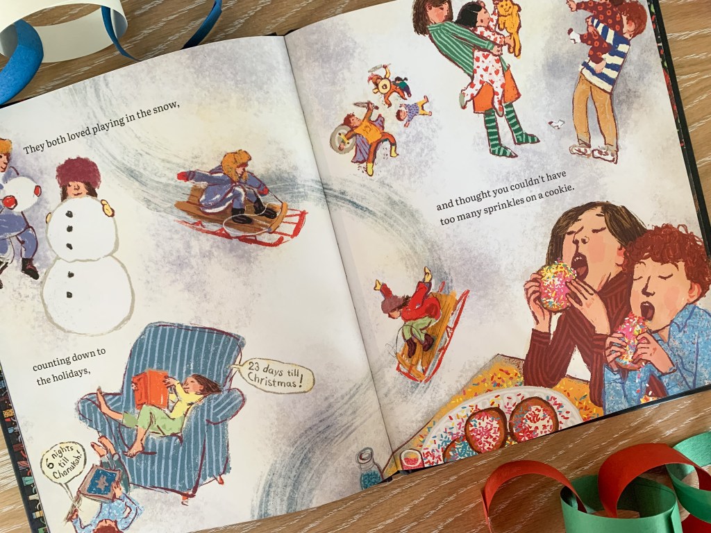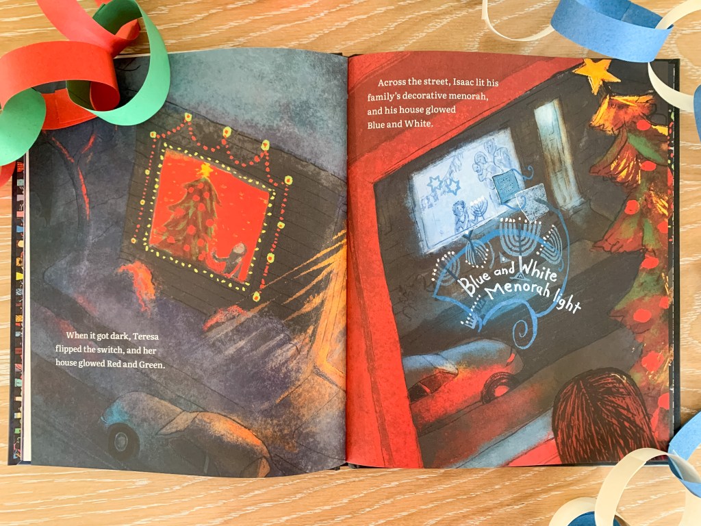 “On a block dressed up in Red and Green, one house shone Blue and White.” I love this opener, because it names and reflects what many of our children notice while driving around in the month of December: the red-and-green houses far outnumber the blue-and-white ones. Chanukah may not hold the same significance within the Jewish calendar as Christmas does for Christians, but it is just as beloved by the children who celebrate it. As a child who celebrated Christmas, I always wondered about the blue-and-white homes in my neighborhood. I always wondered if they felt eclipsed by the sea of red and green.