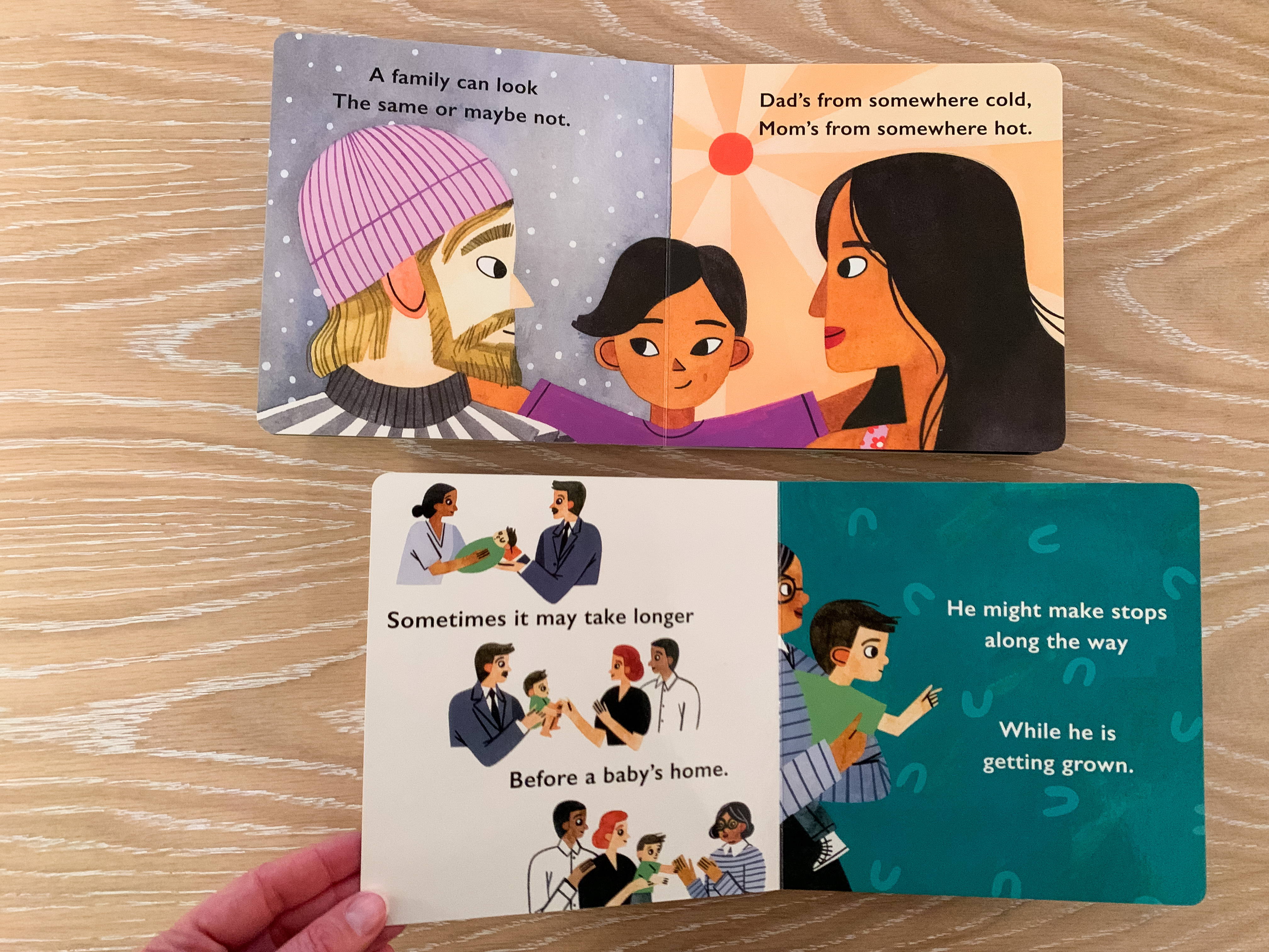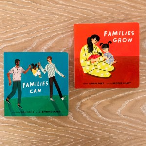 I adore these two inclusive board books, which normalize different types of families for young children. In Families Can, single parents, same-sex parents, divorced parents, only children, large families, children with grandparents in the home, and blended families are all celebrated in pages of rhyming verse. (Just remember: “All homes are better/ With books under the covers.”) Then, in Families Grow, children are introduced to some of the ways that families can take shape, including surrogacy and adoption, without using the technical language. (“The belly might belong to Mom,/ But also it may not./ Sometimes another special belly/ Is the perfect spot.”) Whether the family comes about in the traditional way or not, the emphasis is always on the wish that takes root in a parent’s heart, and the love that paves the way for that wish to come true.