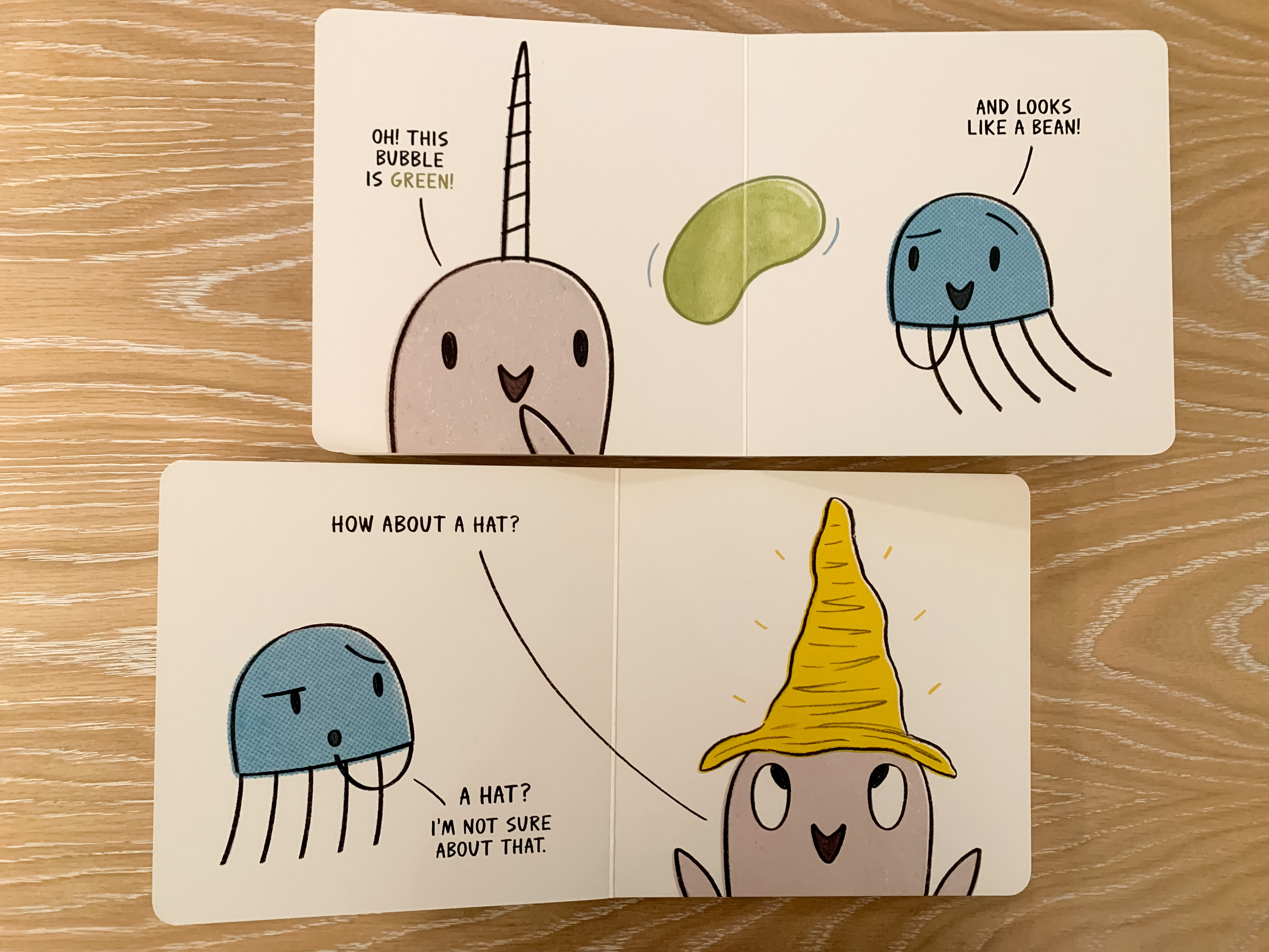 You probably know about the wildly popular early graphic novel series, Narwhal and Jelly, but have you seen the new BOARD books that came out early in 2021? Pared back but with all the charm we’ve come to expect from this Frog-and-Toad like duo, they’re equally terrific for pre-readers and early readers alike. Don’t let the scarcity of words in Bubbles and Blankie fool you: Ben Clanton has a gift for word play, weaving in rhymes and puns alongside pops of color to create stories that beg to be read aloud. In Bubbles, after Narwhal literally bursts Jelly’s bubble, the two set off to find different types of bubbles (“These bubbles are pink! Eew! These bubbles kind of stink!”). In Blankie, the two devise clever uses for Narwhal’s yellow blankie—It’s a tissue! It’s a cape! It’s a picnic blanket!—until they discover it’s big enough to fit around two friends.