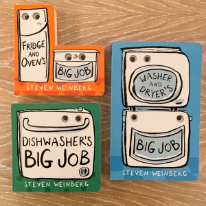 This fabulously fun new series makes my Montessori heart sing. The board book industry is awash with titles about sweet little animals, but what about the things toddlers are really fascinated by, starting with the things that steal their parents’ attention away all day long? With an abundance of onomatopoeia and no shortage of exclamation points, Steven Weinberg brings to life different sets of household appliances. Watch what happens when smelly socks go into the washer, then into the dryer! (Washer and Dryer’s Big Job) Peek inside the sudsy dishwasher as your sippy cup and cereal bowl get a bath! (Dishwasher’s Big Job) Let’s count down and watch the cookies get bigger and bigger until they’re ready to come out of the oven! (Fridge and Oven’s Big Job) As if the insides alone weren’t entertaining enough, how ’bout those googly eyes on the covers?