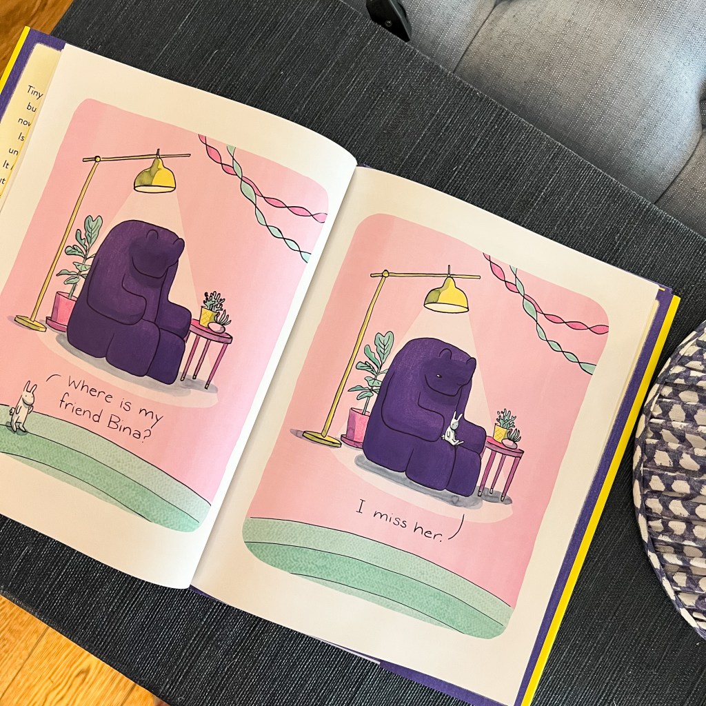 In my favorite spread—no explanation needed as to why—Bina becomes a bookcase lined with books, and Tiny leaves the party long enough to plop down on a petite cushion and read a pink volume. Inquiry. Patience. Acceptance. Comfortable silence. So many of the hallmarks of great friendship are modeled in these sweet, silly pages.