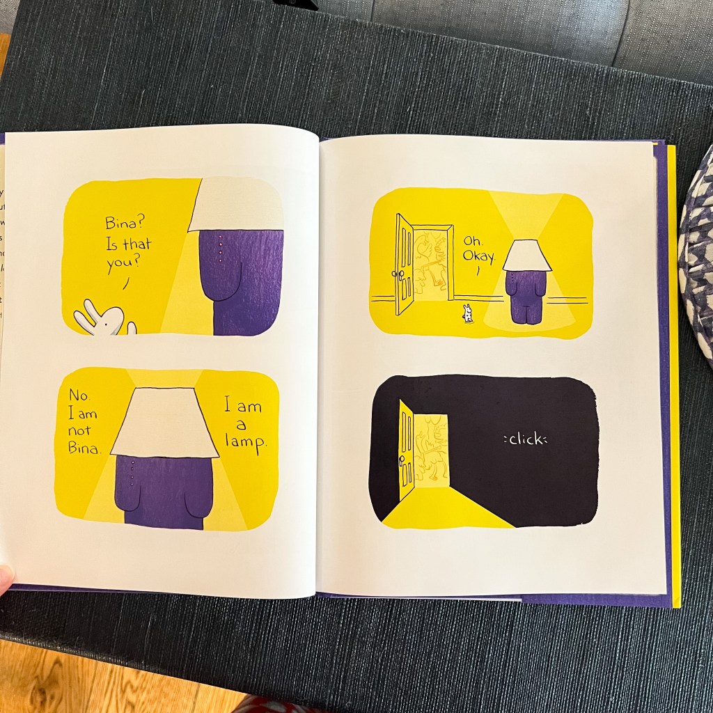And so, Bina Bear hides. This bear of my heart attempts to hide among the furnishings in Tiny’s house. Attempts to become those furnishings, if you will—something familiar to any child who has ever hidden in plain sight with their eyes closed and had a parent humor them. The story unfolds, amusingly and tenderly, through the dialogue between the two friends, as they attempt to navigate their friendship in this new-to-them situation.