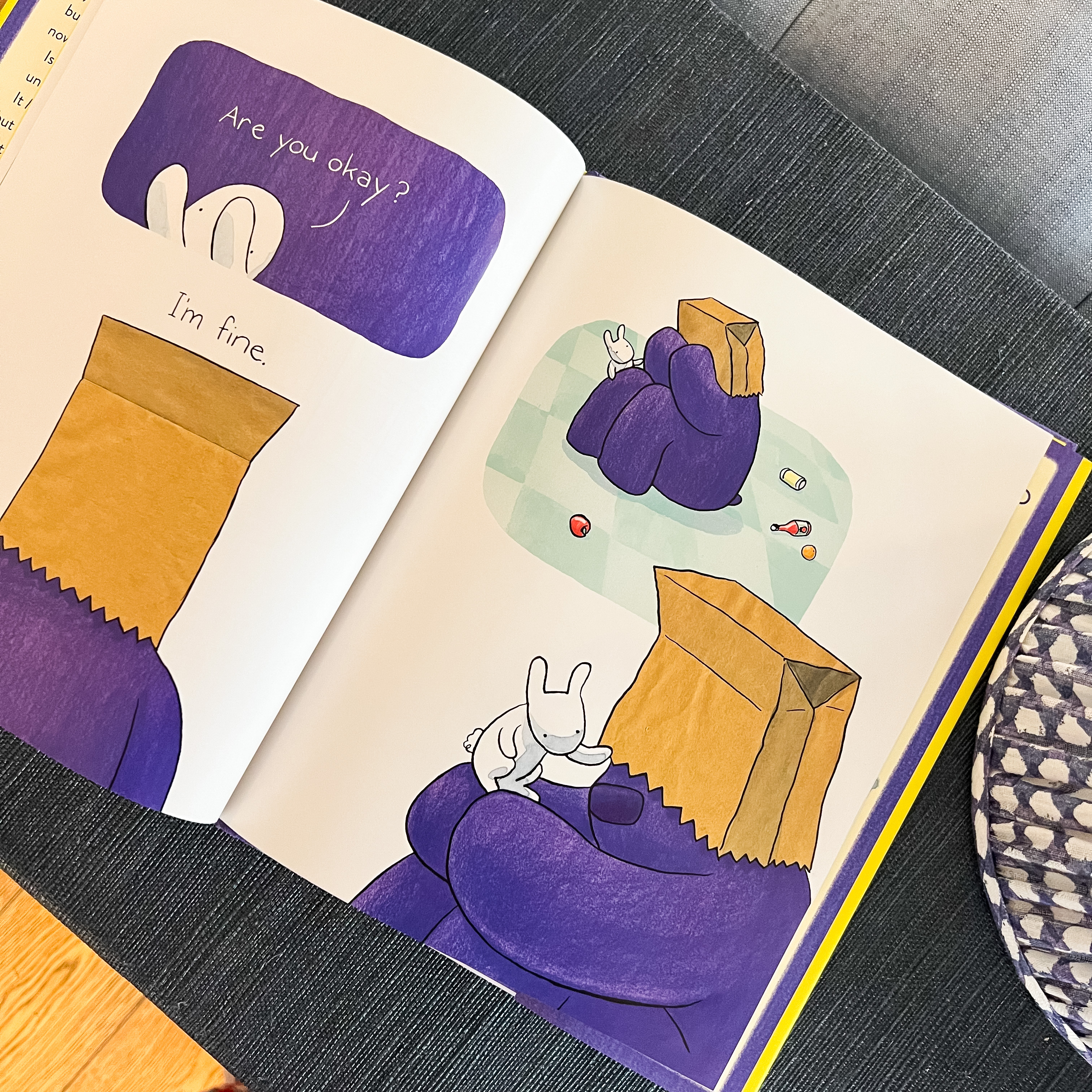 The next time Tiny comes searching, Bina is pretending to be a tree, branches over her head, rope swing dangling from her arm. Tiny hops on the swing. “Do you want some banana, tree?” “Yes.” Each time, Tiny stays a little longer, engages a little more, but always respecting Bina’s boundaries, always following Bina’s lead. When Bina attempts to be a big purple arm chair, Tiny takes a seat and ruminates aloud. Just enough so that Bina opens one eye. “Where is my friend Bina? I miss her.”
