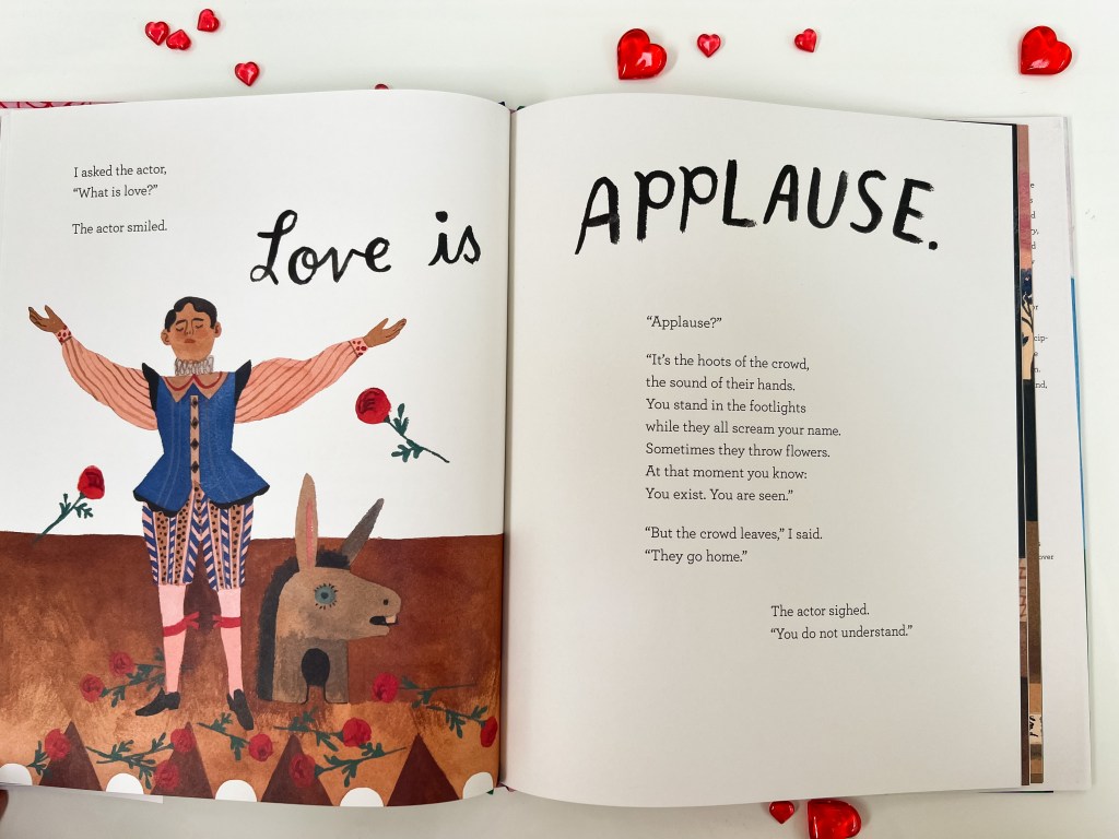 But the grandmother refuses to answer the question. Instead, she embraces the boy and then sends him “out into the world” to look for the answer himself. As the boy goes, as the boy grows, he poses his question to different people and animals, from a fisherman to an actor to a Siamese cat. What becomes increasingly maddening is that everyone has a different answer for him. A farmer tells him love is a seed, while a soldier tells him it’s a horse. The actor says “applause,” the cat says “the night,” and the poet has a list so long the boy doesn’t even have the patience to hear it. How can love look so different to so many?