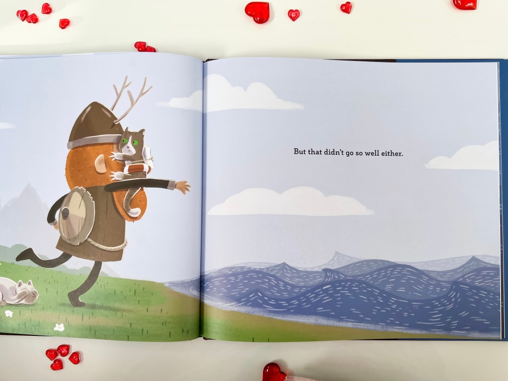 That night, Stig gets to work using paper to “get his feelings into words.” He pens Ingrid a love note, dotting the second “i” in her name with a heart. But, the next day, when Stig finally spots her, she’s too far away to retrieve the note. Desperate, he ties the note to one of his cats and attempts to fling the feline into the water (after all, The Art of Kitten Tossing is on his nightstand, a Viking specialty). Did I mention Stig’s cats hate water more than Stig?