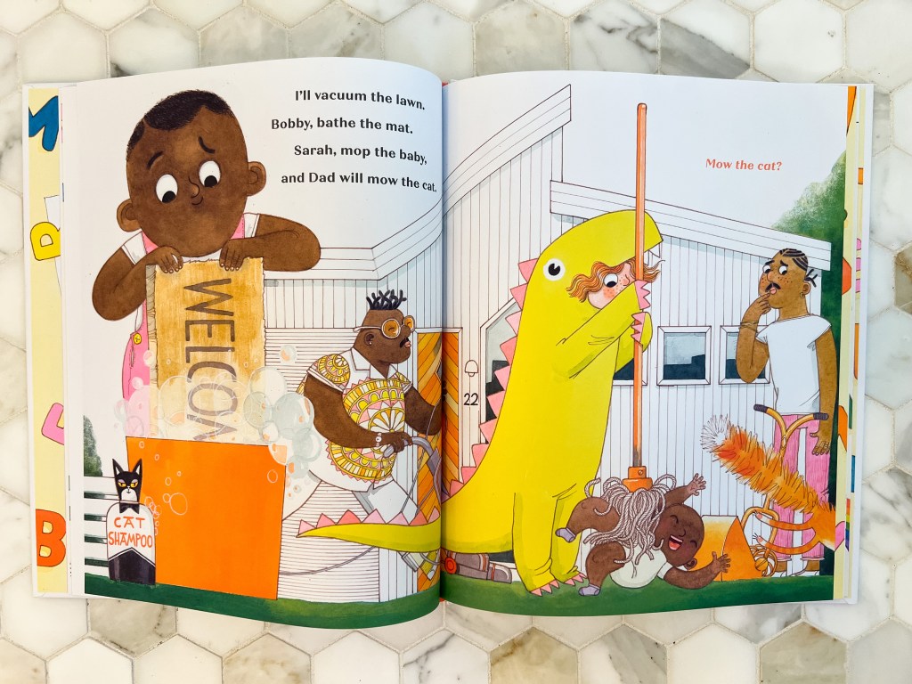 By the time everyone gets down to work, they don’t notice the chores they’re doing are preposterously out of whack. But the reader does. And therein lies the fun, because watching an older sibling (dressed in a fluorescent dinosaur costume) try to mop a giggling baby is great fun.