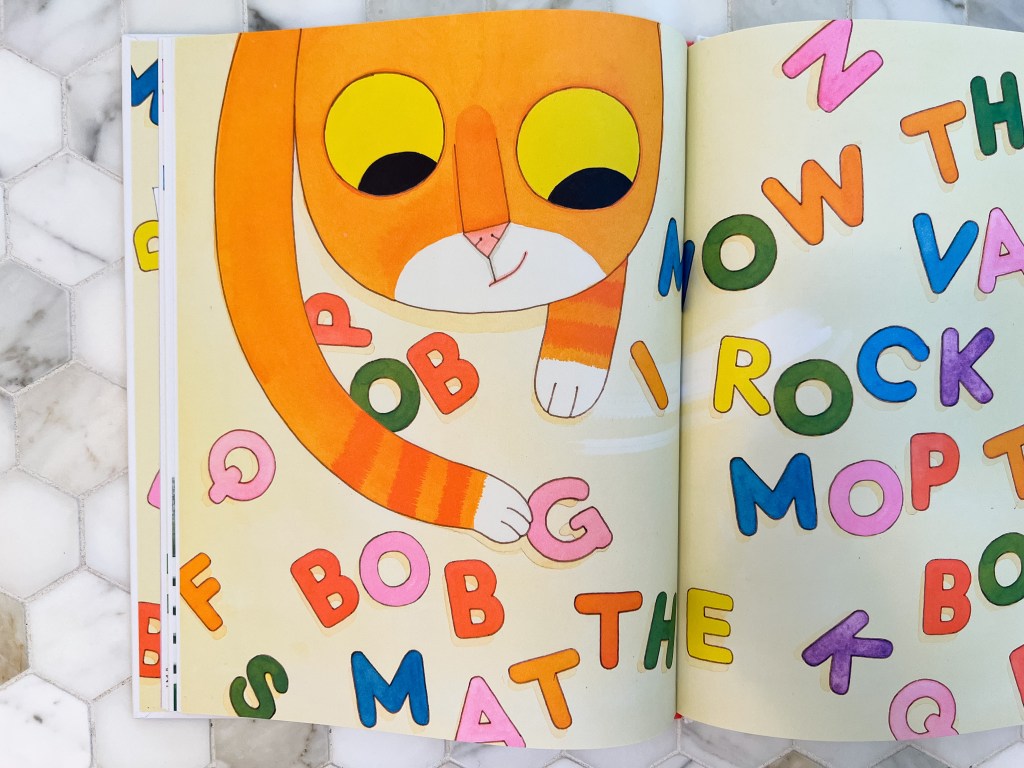 I immediately thought of Alice B. McGinty’s absurd—and absurdly funny—new picture book, Bathe the Cat (Ages 4-8), brilliantly illustrated as per usual by David Roberts (you know him from the beloved “Questioneers” series—most recently, Aaron Slater, Illustrator). While a family scrambles to ready their house for Grandma’s visit, their pet cat repeatedly and mischievously scrambles the chore list—spelled out in magnetic letters on the fridge—resulting in a mayhem of misunderstandings. Sweep the dishes? Scrub the fishes? Mop the baby? Bathe the mat? Just you wait.