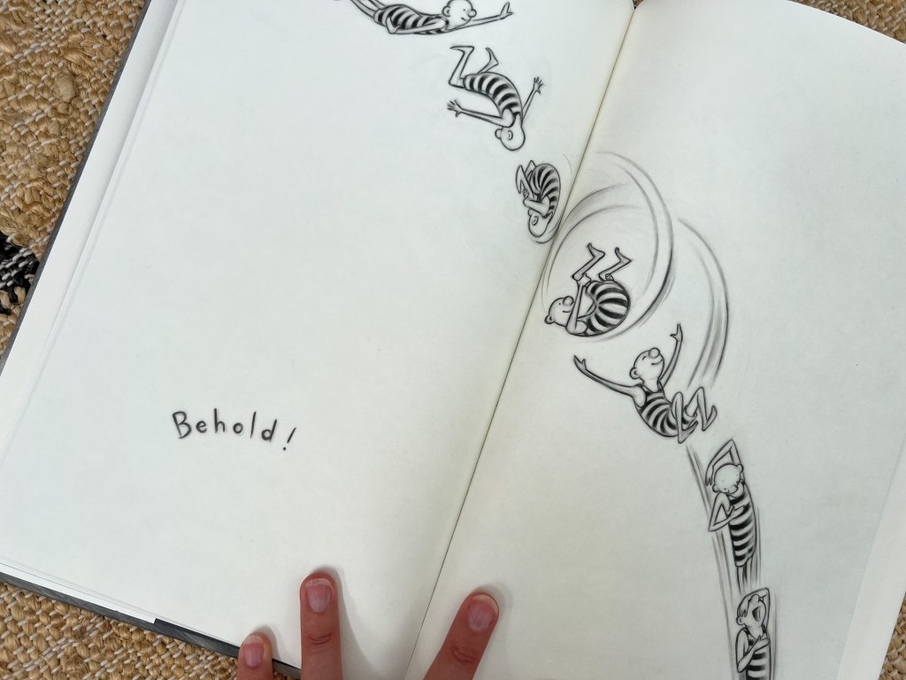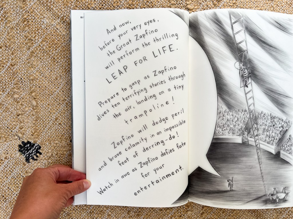 Because Zapfino bails. When the ringmaster turns around, Zapfino is gone, better versed at disappearing acts than at defying heights. Sit with this for a minute: when was the last time a main character was allowed to opt out of bravery? Jump ship without, in this case, actually jumping? What a gratifying concept for a child to explore: rather than pushing yourself to do something uncomfortable, rather than performing purely for the sake of others’ entertainment, it might be worth the embarrassment of stepping out of the limelight completely. In this moment, Zapfino becomes the anti-hero. (Until he doesn’t.)