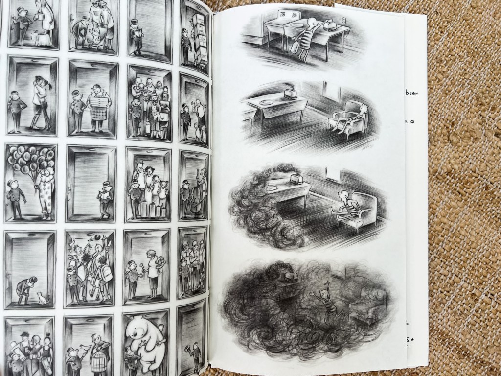 Still, the unresolved business of heights comes to a head when Zapfino dozes off while toasting bread. The toaster catches on fire., and the smoke quickly spreads. Marla Frazee could have had any number of reasons for choosing a grayscale palette for the book—it enhances the cinematic quality of the story, for one, as well as creates a blank slate for possibility—but on a purely tactical level, it allows her to illustrate a fire without terrifying her young reader.