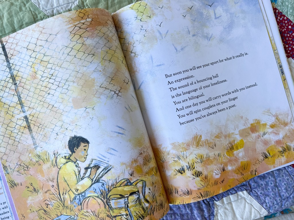 Another child goes “everywhere with a ball,” a fierce competitor on the field and court, but one day they realize the sound of the bouncing ball was an attempt to fill the silence of loneliness. As we watch, that same child “spin[s] couplets on [their] finger” in the form of poetry that connects, assuages, completes.
