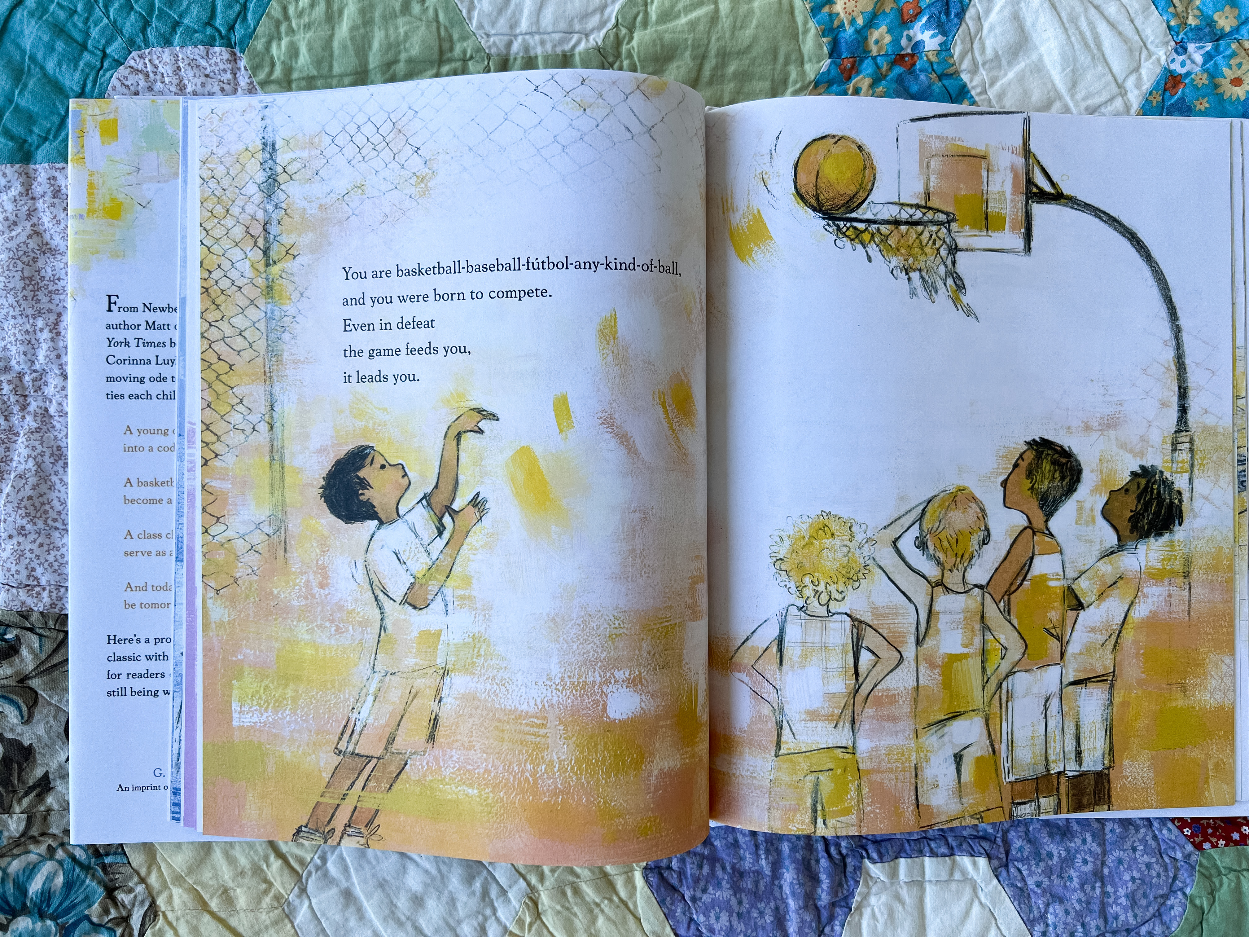 These resounding words come near the end of Patchwork (Ages 5-10), a stunning collaboration between two of our family’s favorites: Matt de la Peña (of Last Stop on Market Street) and Corinna Luyken (remember when I interviewed her here?). A paean to self-discovery, the book speaks to the capacity of children to change. Even as it highlights six specific children’s experiences, the second-person narration feels universal: the “you” is at once the child pictured in a pink tutu and the young reader studying her on the page.