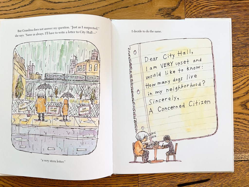 When Louis tells his grandmother that he wants a dog, she answers, “Nonsense! There are enough dogs in the neighborhood already.” But when he presses her further, she can’t give him a number. Nor, it turns out, can City Hall, to whom he writes at the example of said grandmother, who is busy making her own voice heard about a different community issue. “Louis…sometimes if you want something done you’ve just got to do it yourself.” Grandma may appear a bit rough around the edges to most folks, but she’s exactly the supportive partner Louis needs.
