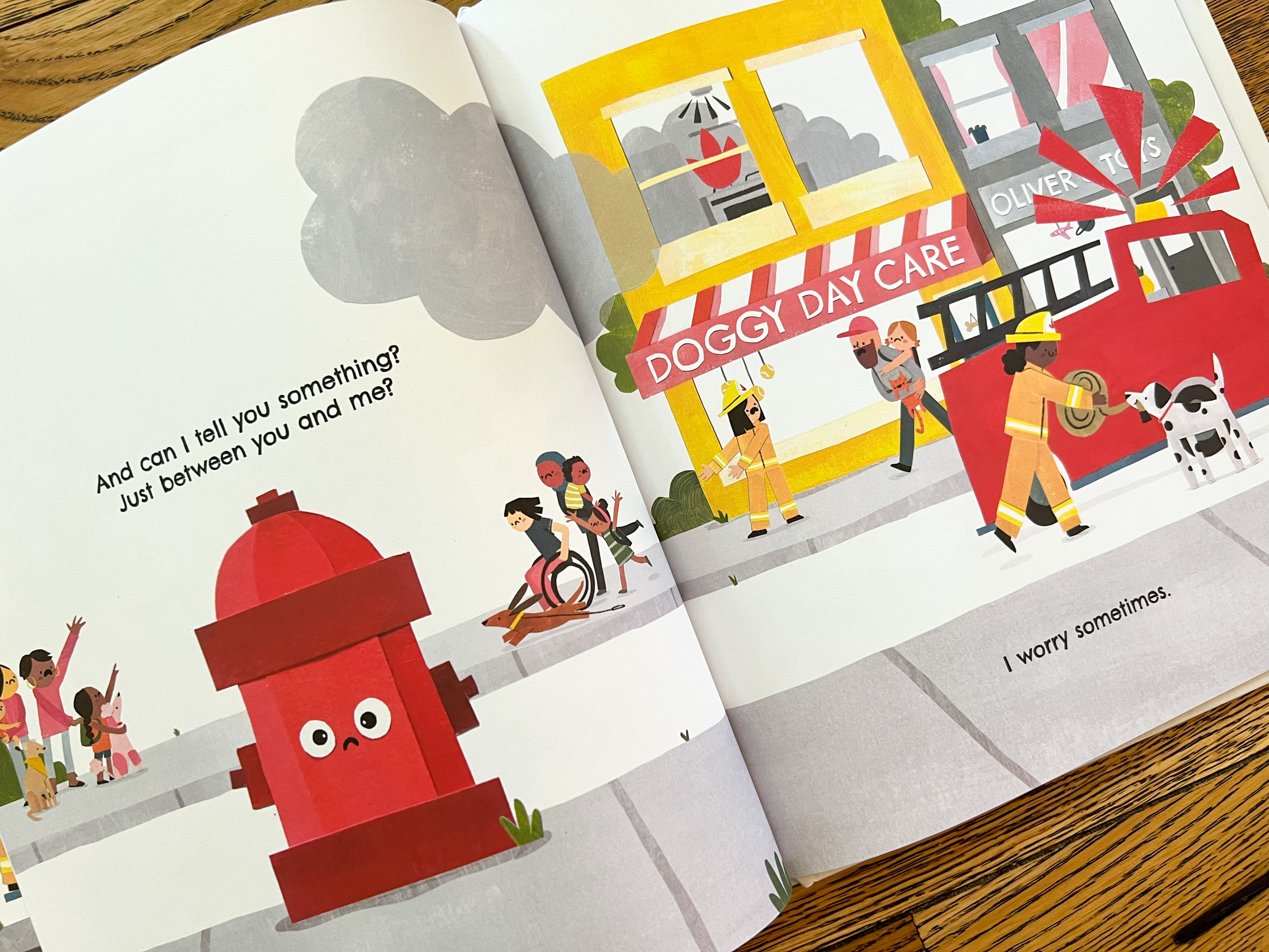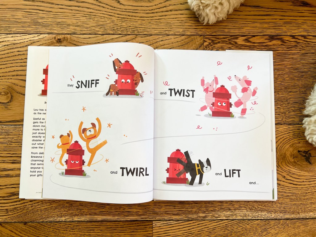 Don’t misunderstand him: Lou is happy to be useful. And he loves dogs. “It’s just that sometimes…deep down inside, I feel like there’s more in me than what they can see.” Lou doesn’t realize how literally accurate this proclamation is, but we readers do: the artwork reveals a pipe of blue water running down the street and into the hydrant’s base. In fact, half the fun of this story are the details the reader will catch before Lou does. As Lou speculates about the different jobs he might aspire to—neighborhood DJ?—the reader spots a kitchen fire above a Doggy Day Care. As Lou confides in us about his existential worries, the reader notices fire engines arriving. And as the fire fighters sprint towards Lou with hoses in hand, a Dalmatian approaches with more on his mind (finally!) than a friendly whiz.