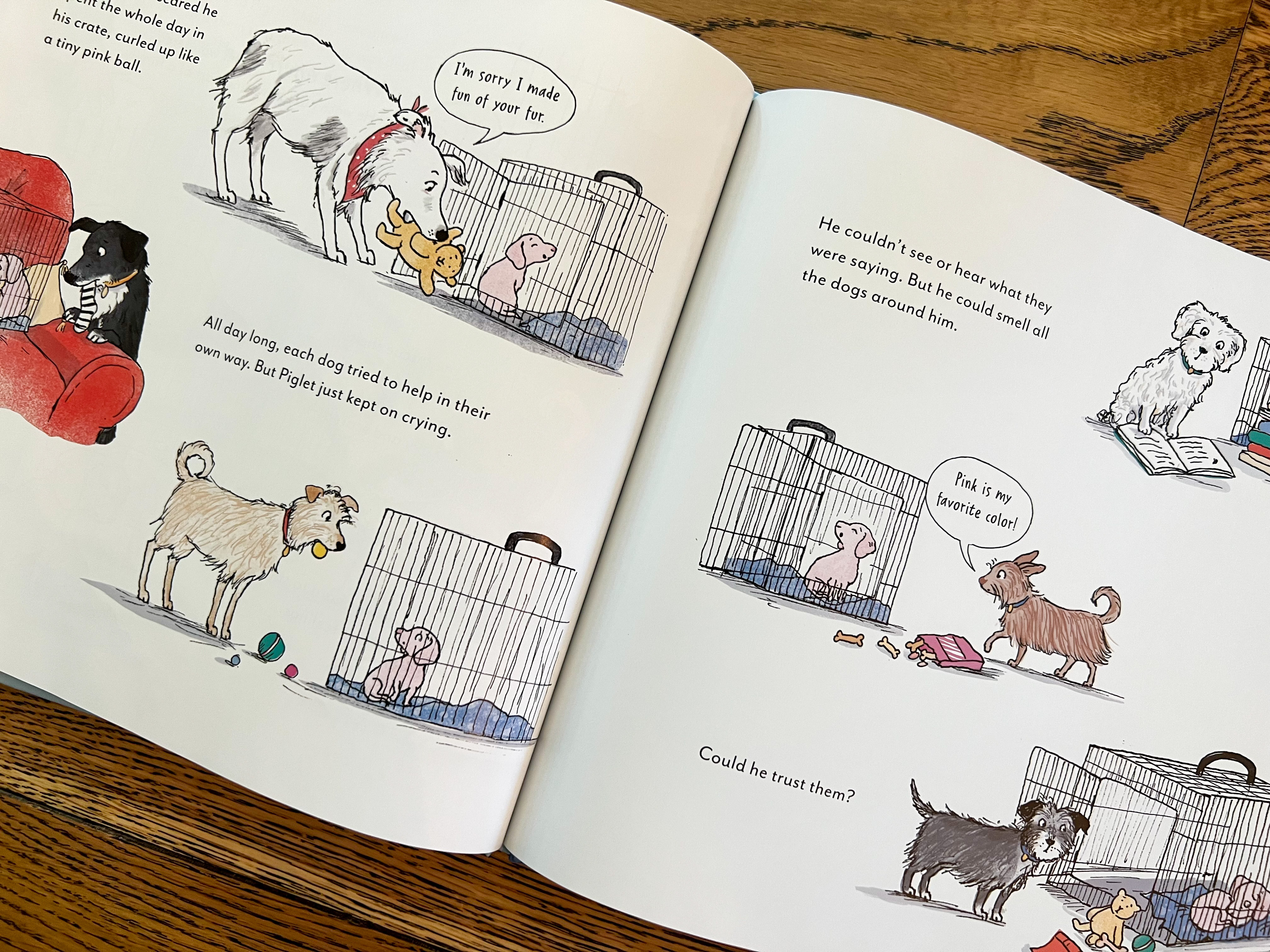 The story of Piglet’s dramatic arrival is all the more engaging thanks to the speech bubbles that populate around the other dogs, belaying their hopes for the newcomer—I hope it’s “a pup who likes to play ‘pounce’ like me!”—followed by their ensuing confusion at what arrives instead (“I could swear that is a piglet”). In addition to looking nothing like the other dogs, Piglet can neither see nor hear well. As the dogs take turns approaching Piglet’s crate, Piglet just whimpers. Even the house, with its towering staircase, is all kinds of scary. (Did I mention our pup took days to get up the nerve to try the stairs in our house?)