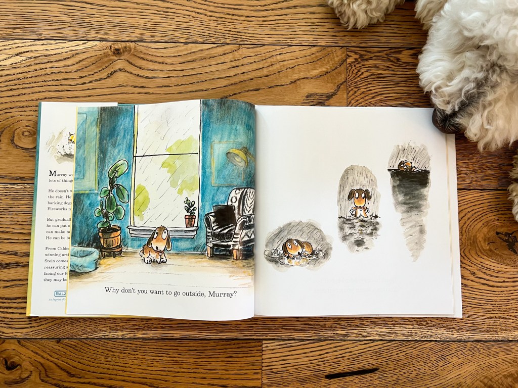 “Don’t worry, Murray” and “Good boy, Murray” are repeated throughout the book, as the narrator coaches little Murray through a walk in the rain, a trip to the dog park, a BBQ, and back home to bed. The text is kept to a minimum so that David Ezra Stein’s signature watercolors can shine, from Murray’s forlorn eyes in his yellow slicker to his bouncy, excited body language after making a furry friend.