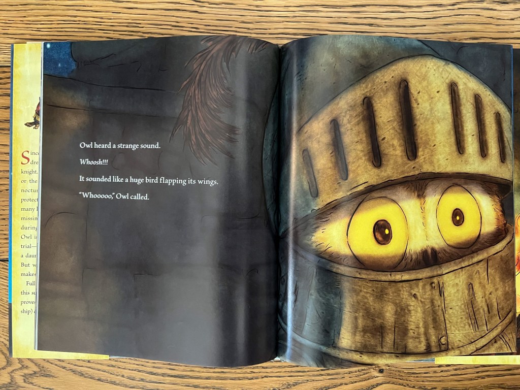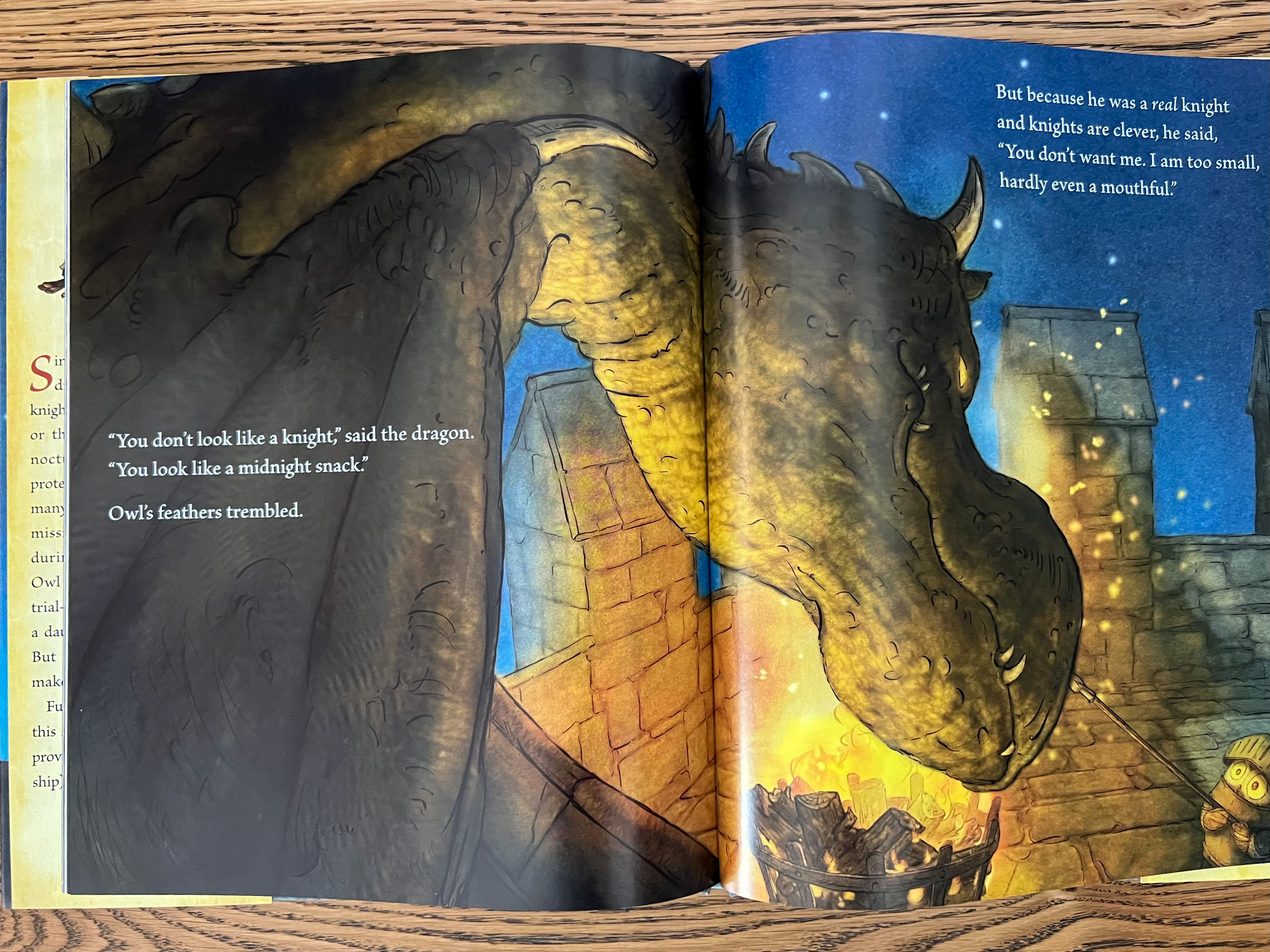 Still, Owl perseveres, graduating to the Knight’s Night Watch, where his nocturnal nature serves him well. But what happens when tiny Owl finally comes face to face with the ginormous, fire-breathing dragon that has been eating his way through the kingdom? Spoiler alert: there might be pizza involved.