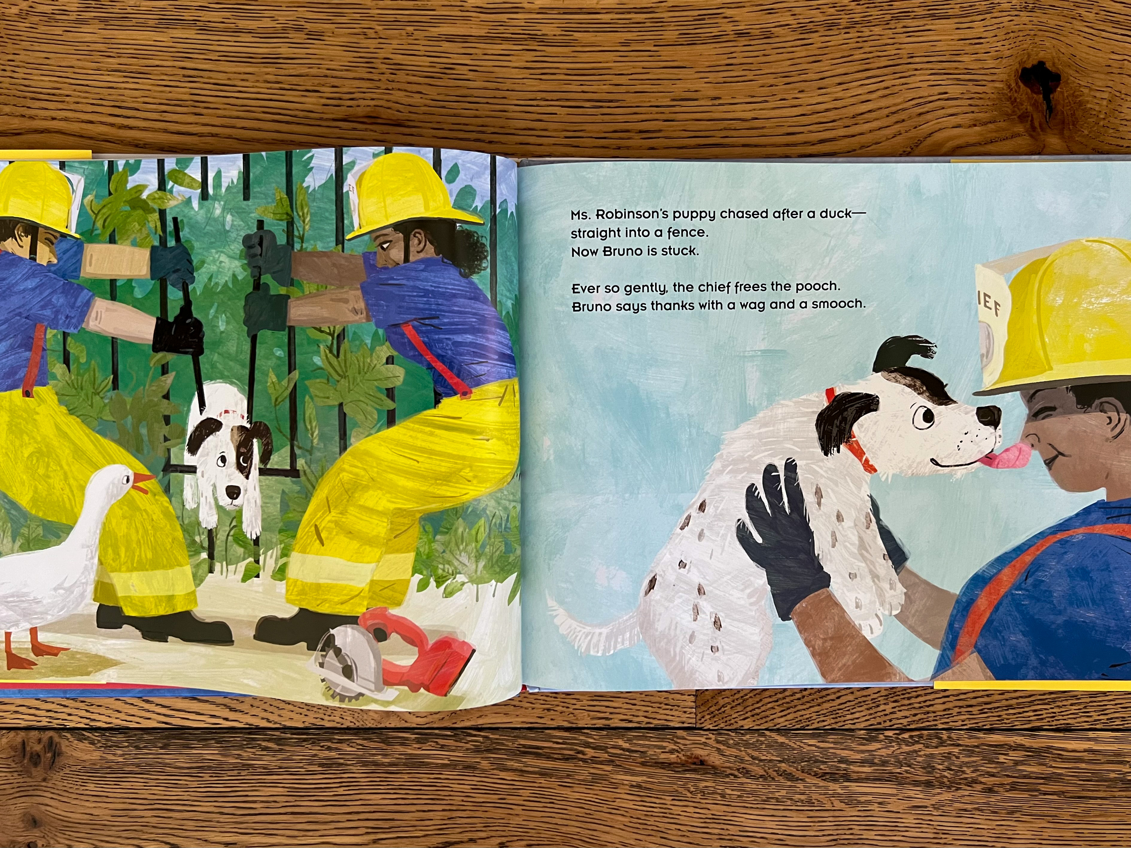 How a fire chief and her crew keep their community safe is on full display in Fire Chief Fran, an energetic, rhyming, day-in-a-life story. We begin with routine inspections at the station, when suddenly “lights begin flashing,/ and—CLANG!—the bells blast./ They leap into action—/ they need to move FAST!” It’s not just two fires that keep the firefighters busy on this particular day; there’s also a dog stuck in a fence, two injured soccer players, and a downed tree. In between emergencies, the crew lifts weights, drills, cooks, and gives a fire safety talk to a group of kids. Primary colors abound in the digitally enhanced acrylic paintings which are as dynamic as the day at hand and its fearless leader.