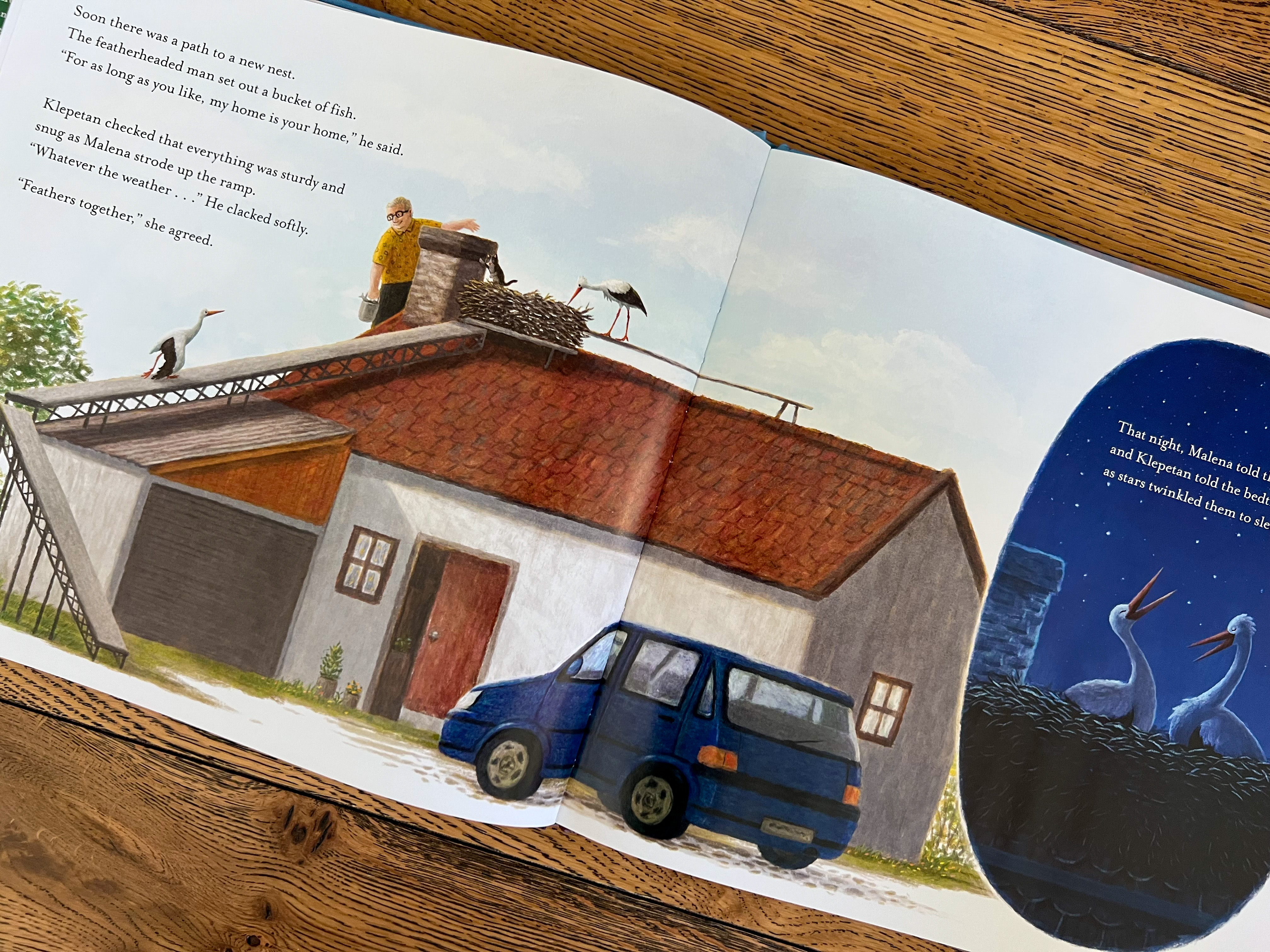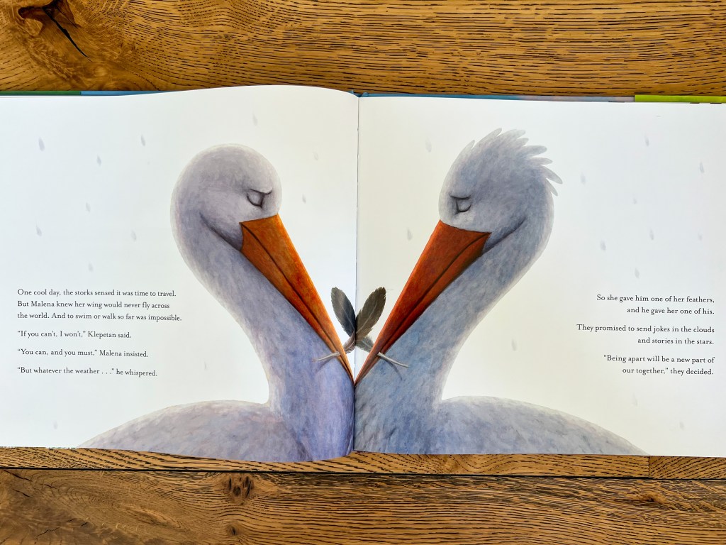 Klepetran and Malena are inseparable: “whatever the weather, feathers together!” But on their spring migration from South Africa to Croatia, Malena’s wing is injured. With the help of a ramp cleverly constructed by the “featherheaded” old man who lives in the house atop which the storks want to nest, Malena is able to come and go from the nest. But she is not able to make the trip back to South Africa. Come fall, Klepetran must go on without her, and the two exchange a single feather in parting. “Friendship survives all kinds of goodbyes,” the old man whispers to the pair, as he tucks them in for their last night together.