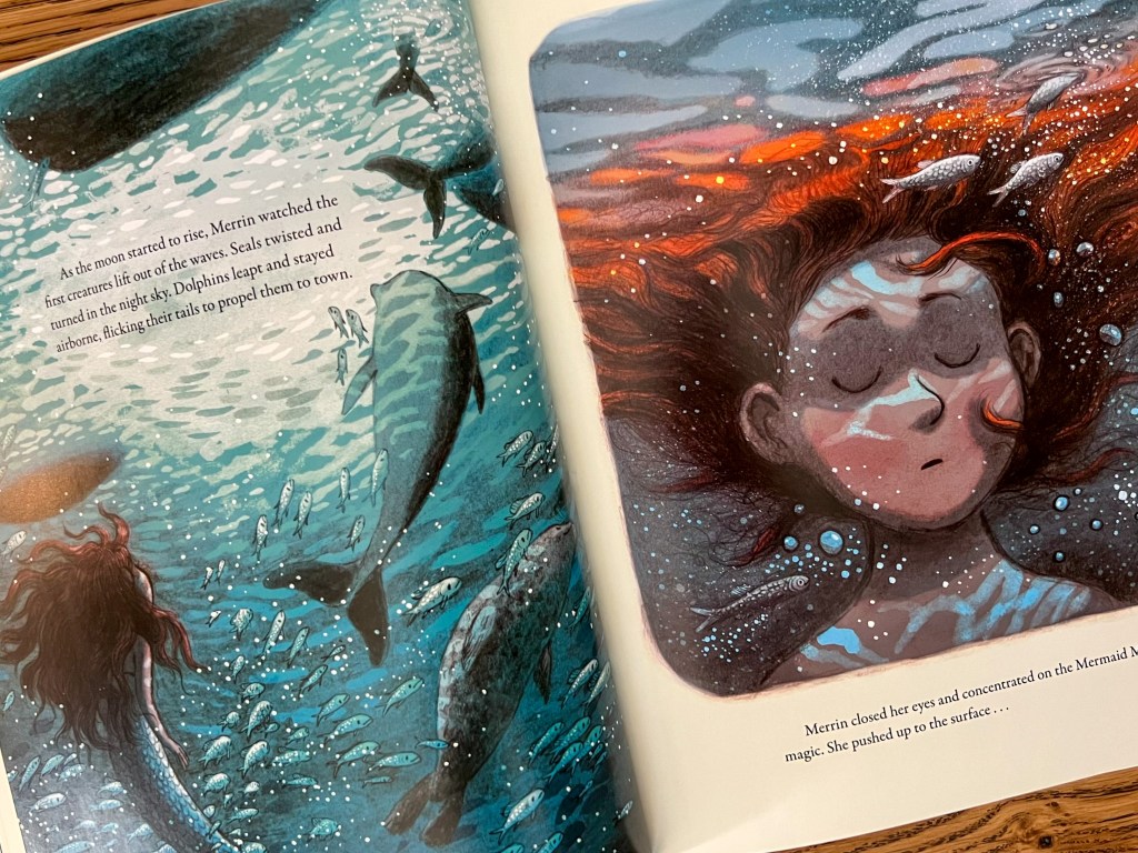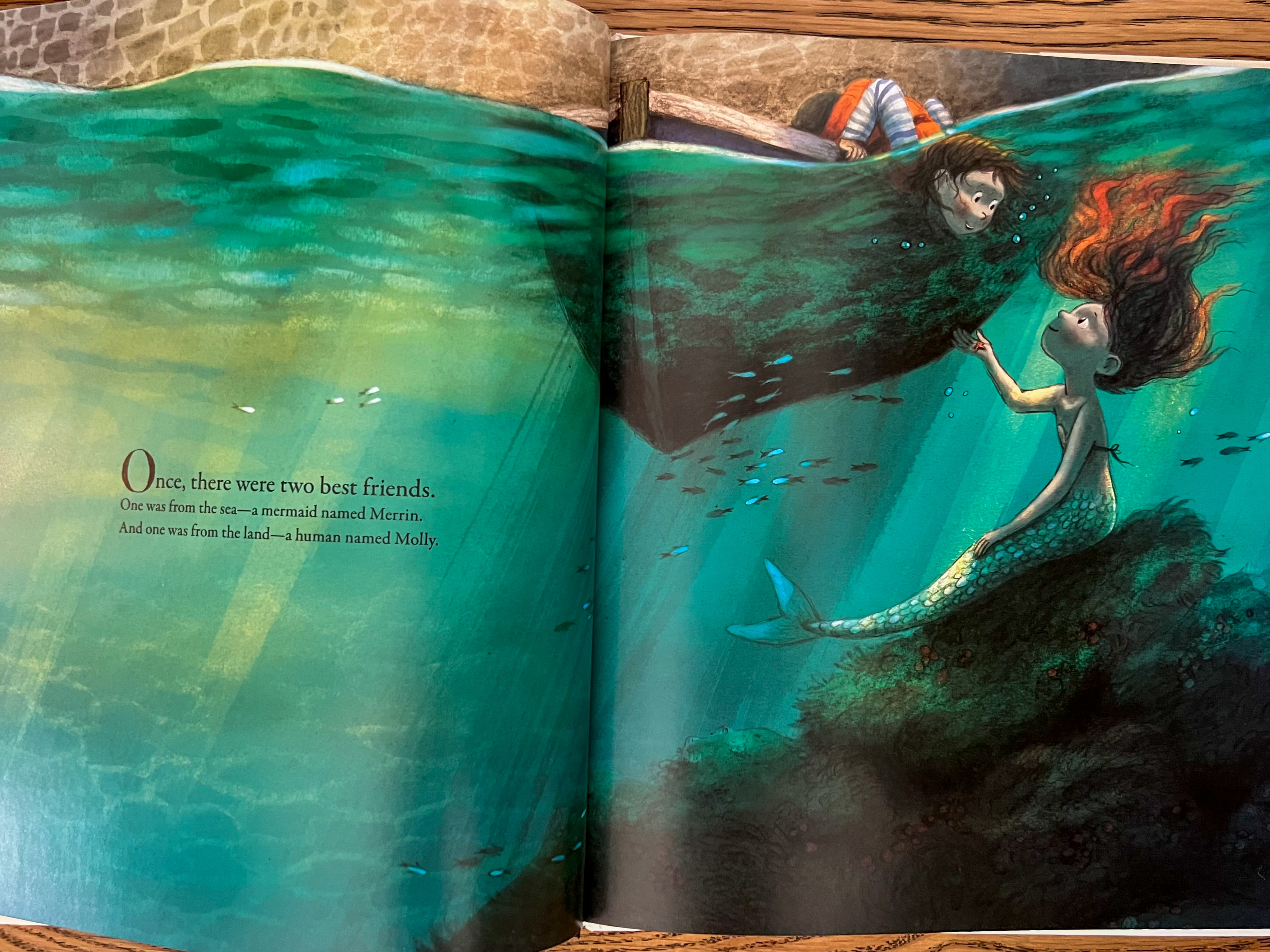Remember the excitement of a friend coming to your house for the first time? Molly and Merrin are used to playing together every afternoon after school, but they’re limited to what they can do by the seaside, with Molly swimming above the water and Merrin diving below. Tonight, however, is the annual Mermaid Moon festival, and with Merrin finally old enough to participate, she’ll be able to “swim through the air to explore the human world.”