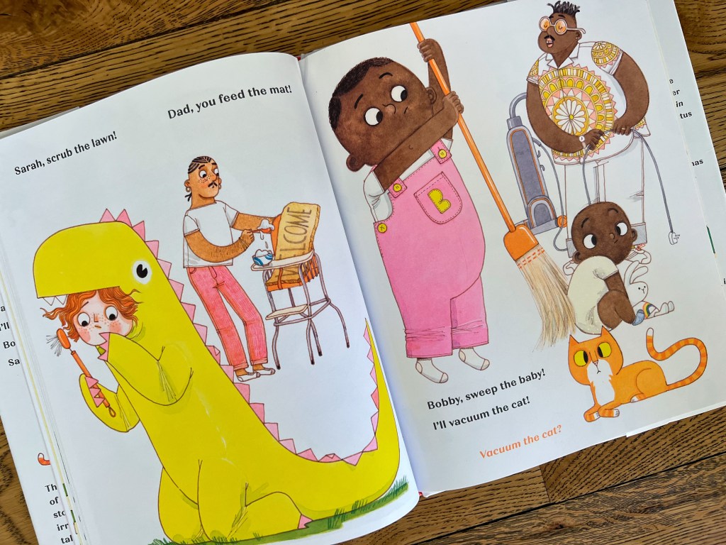While a family jumps into action to ready the house for Grandma’s impending visit, their pet cat keeps mischievously scrambling the chore list, spelled out in magnetic letters on the fridge, in order to avoid ending up with a bath. Everyone is moving too quickly to notice the errors until they’re well on their way to the mayhem of misunderstandings. Sweep the dishes? Scrub the fishes? Mop the baby? Bathe the mat? Just you wait.